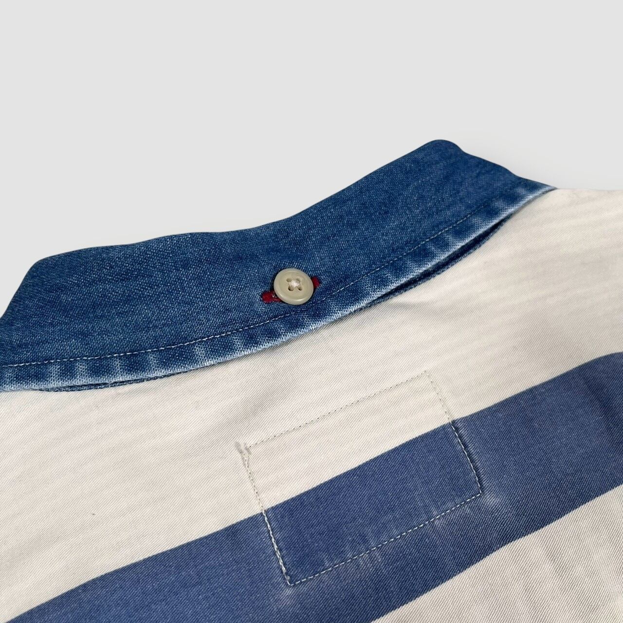アシンメトリーなストライプが目を引きます、襟がデニムになっているのも良いアクセントです