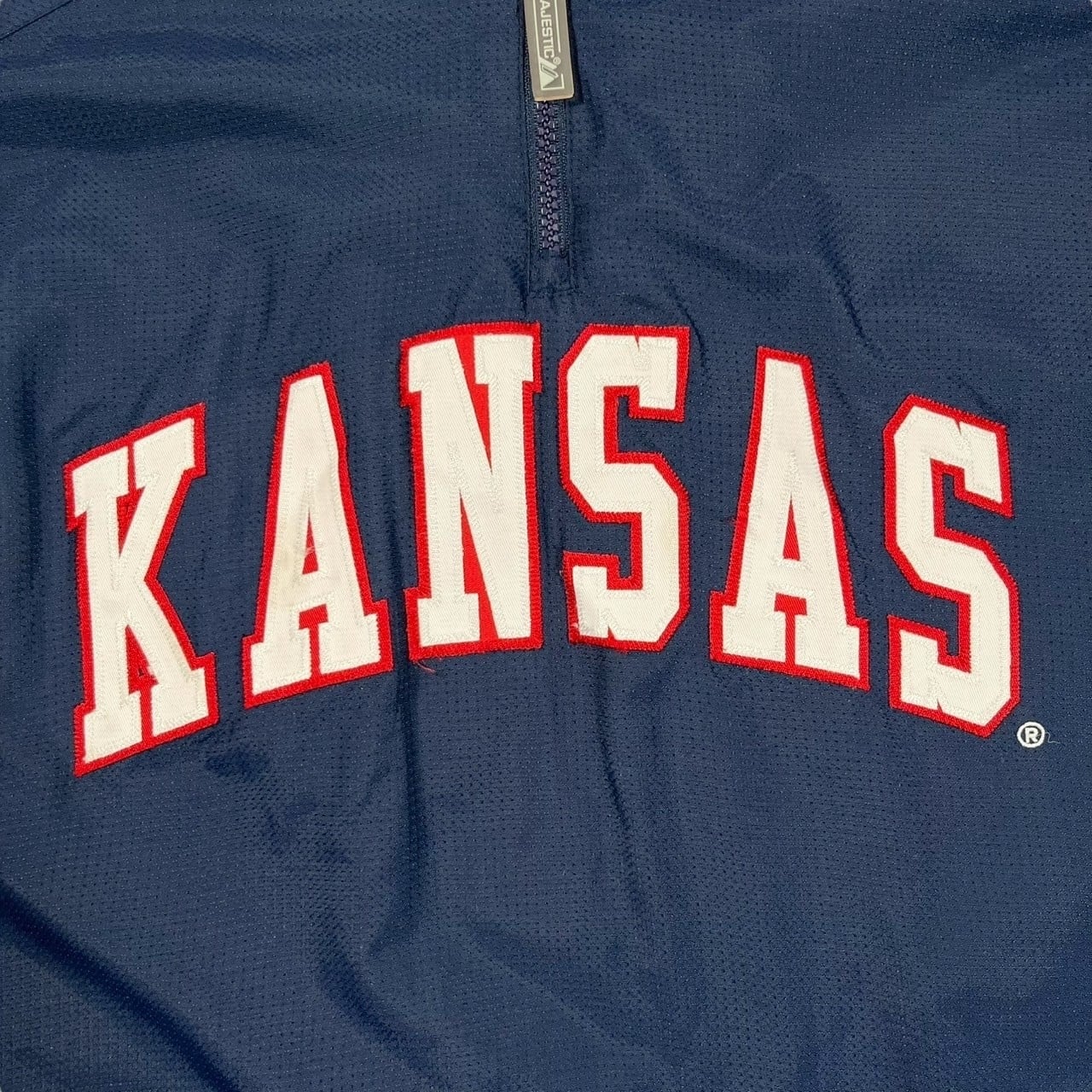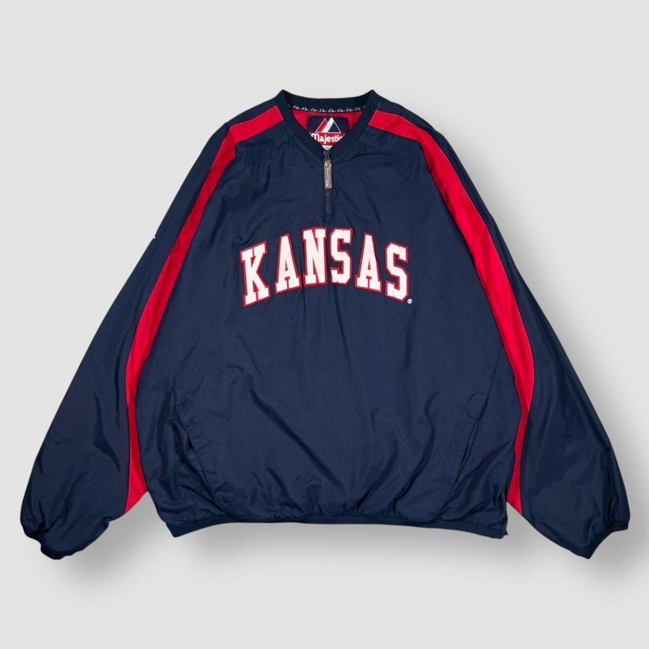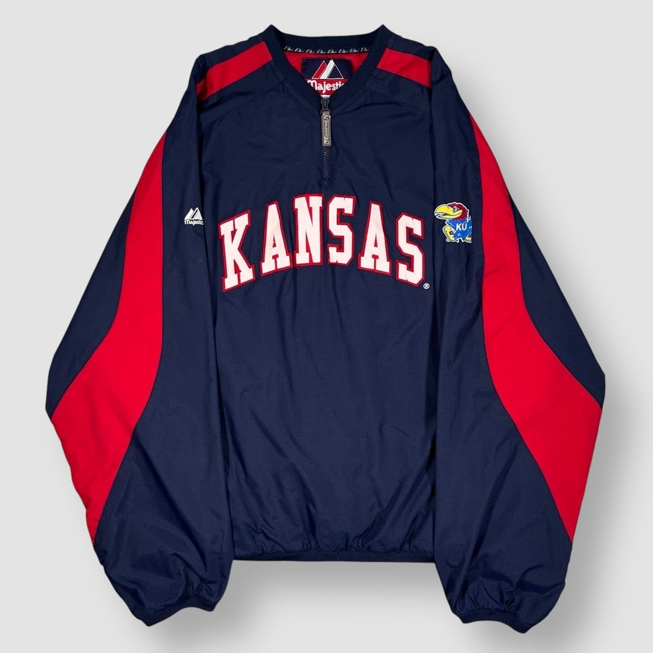 Majestic製、Kansas Jayhawks(カンザス大学)チームロゴ入りのナイロンプルオーバージャケット