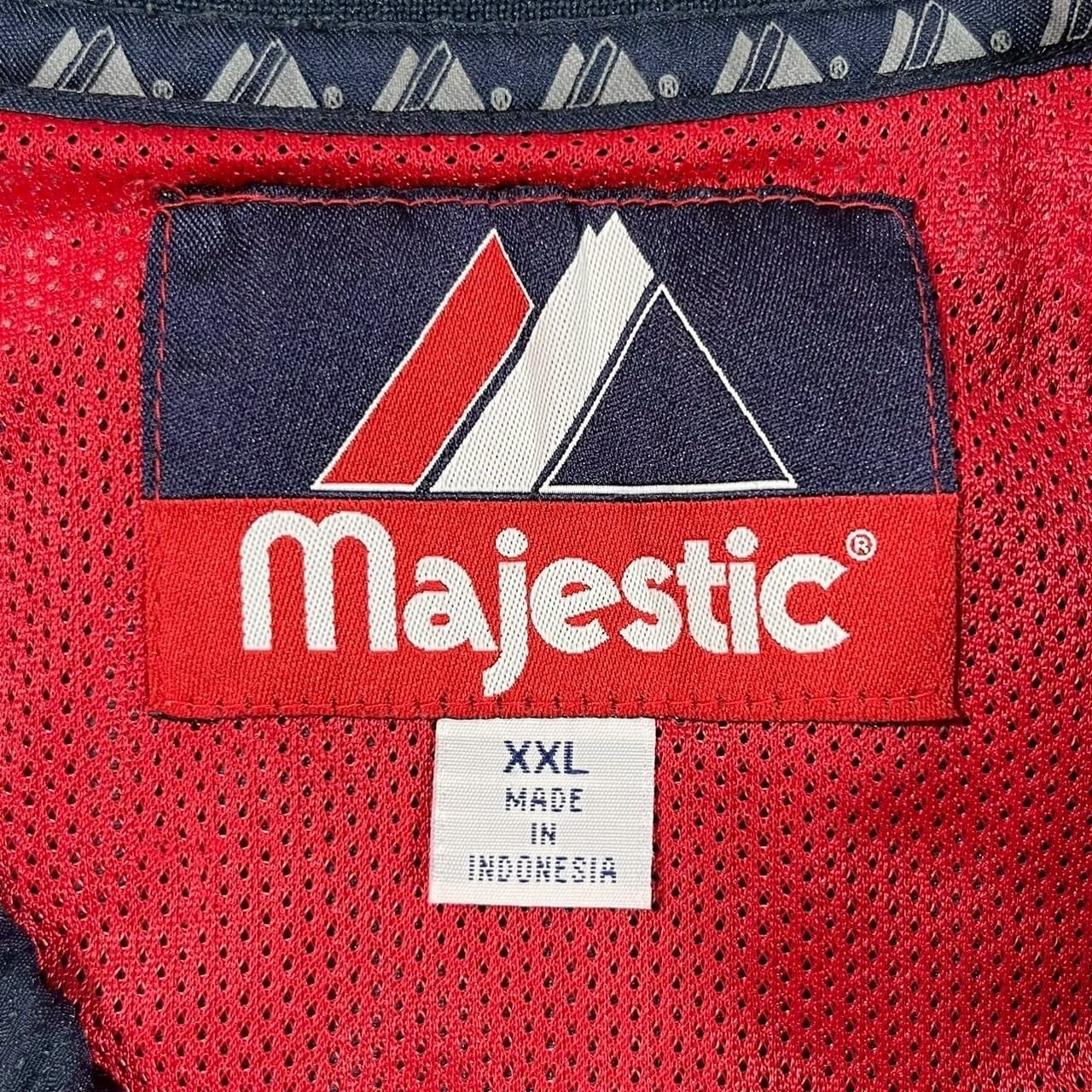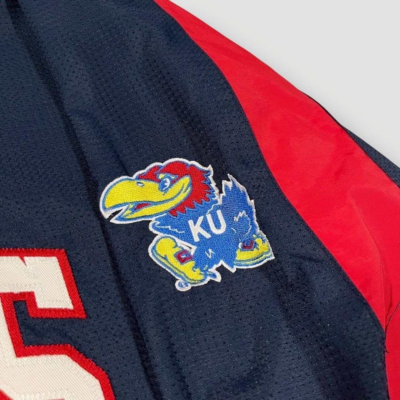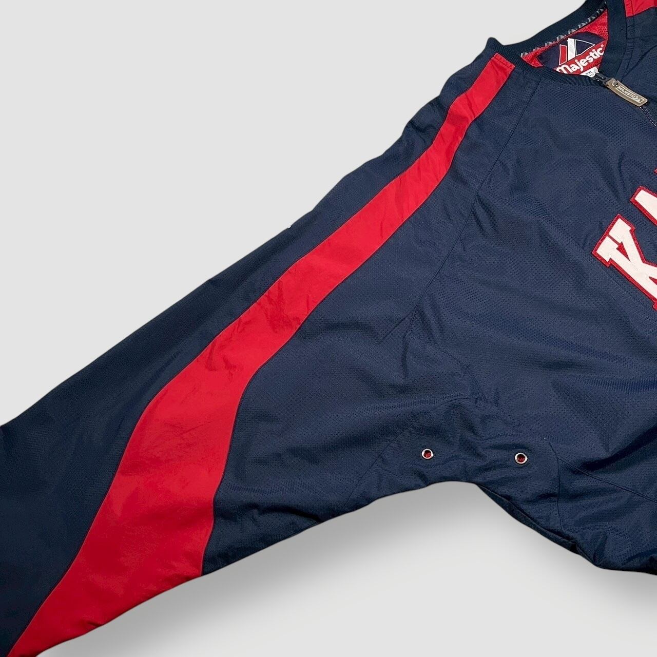 Majestic製、Kansas Jayhawks(カンザス大学)チームロゴ入りのナイロンプルオーバージャケット