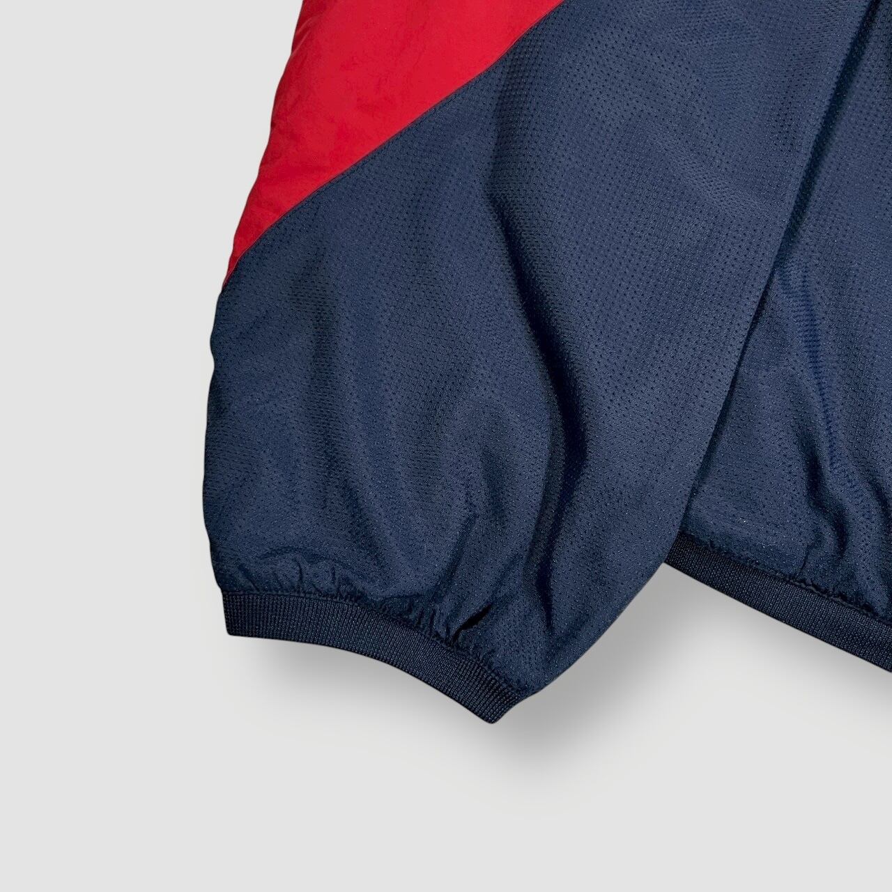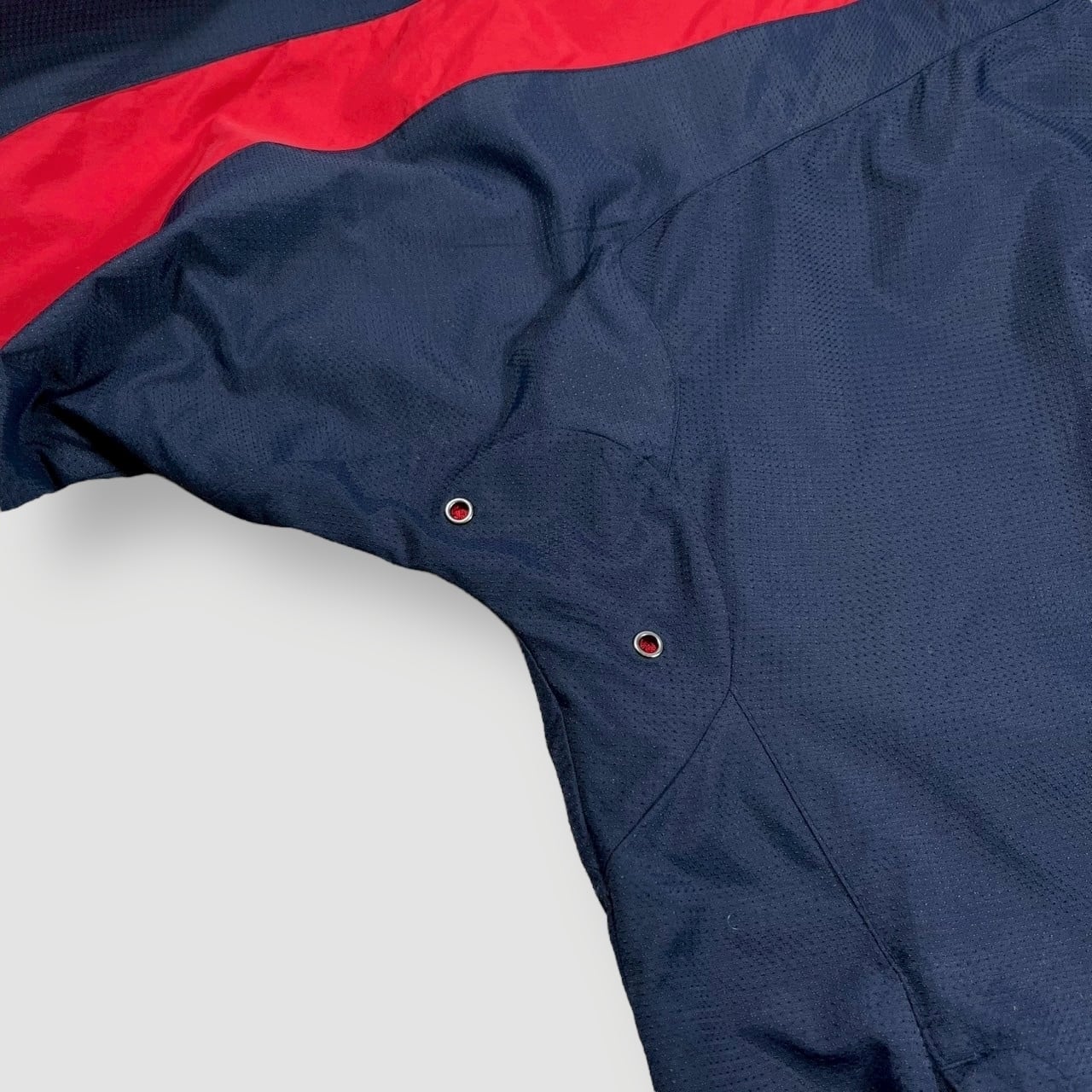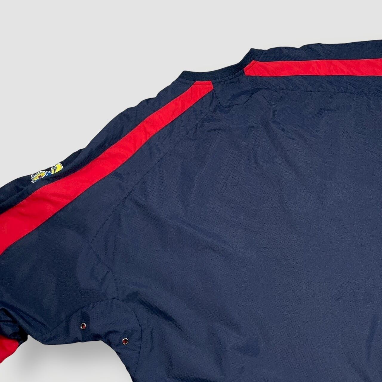 ネイビー×レッドのカラーリングに、胸元と袖にワッペンが入り、スポーティかつキャッチーな一着です