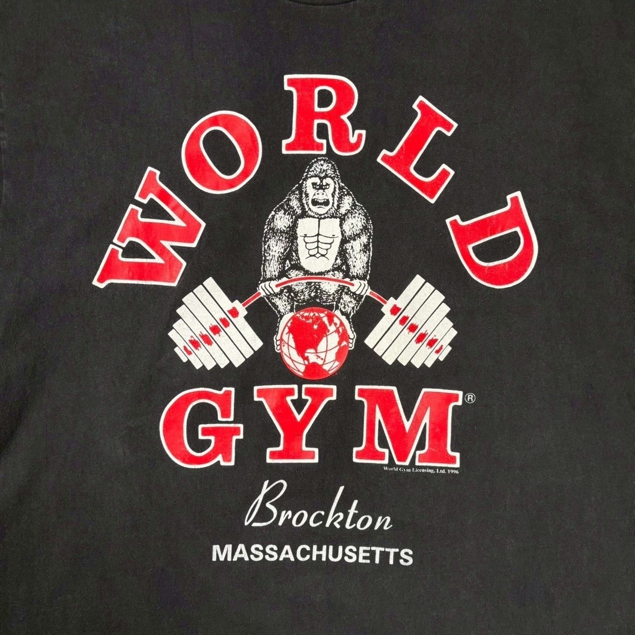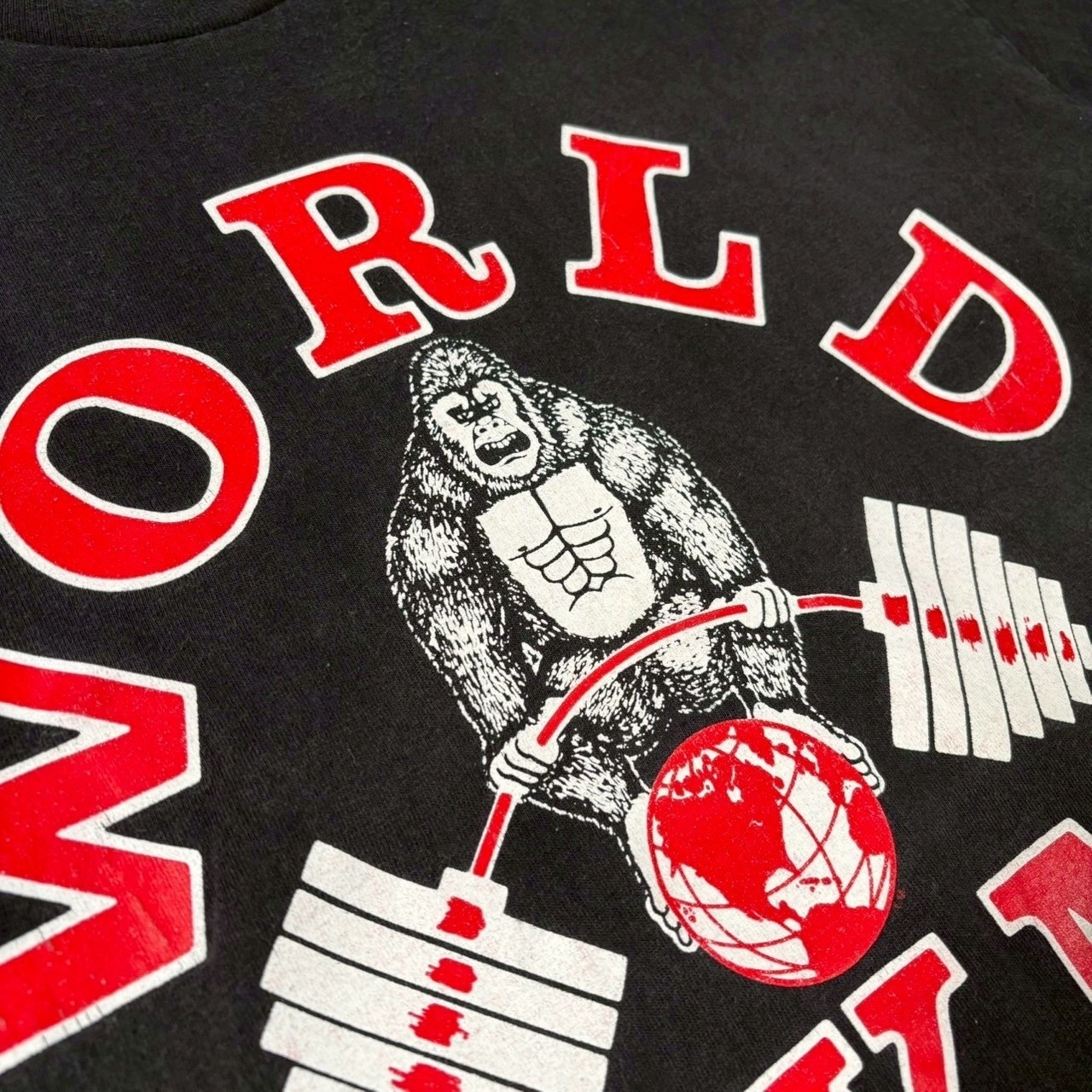 ブランドアイコンのゴリラがバーベルを掲げるインパクトのあるリンクプリント、1996年コピーライト入り