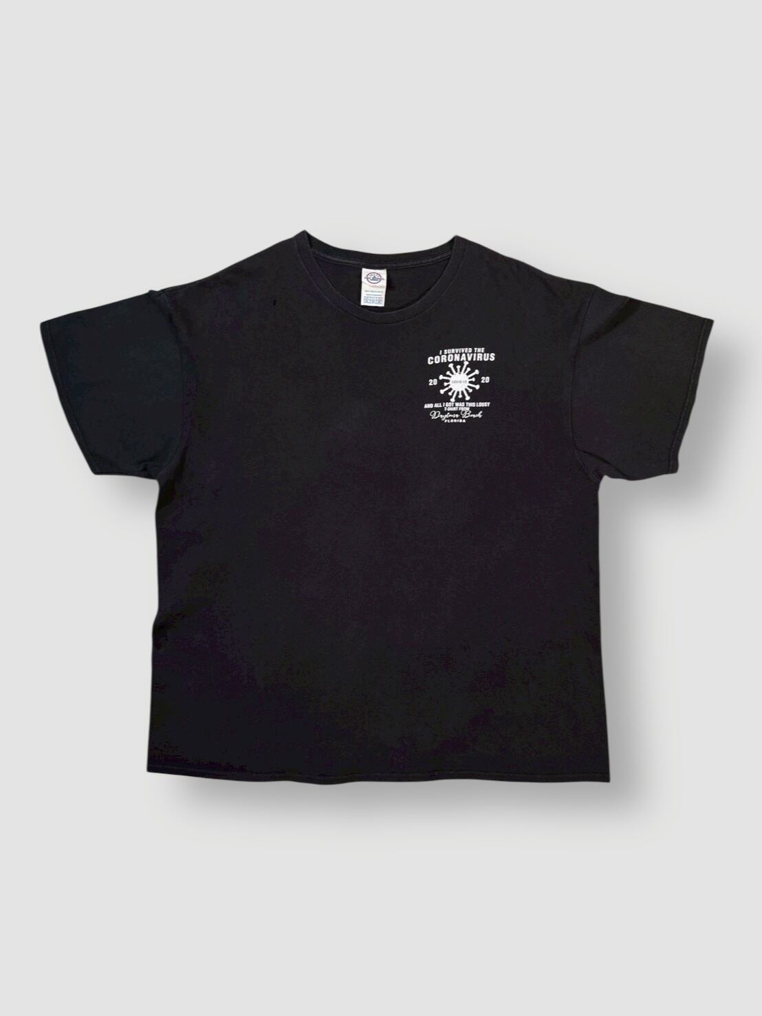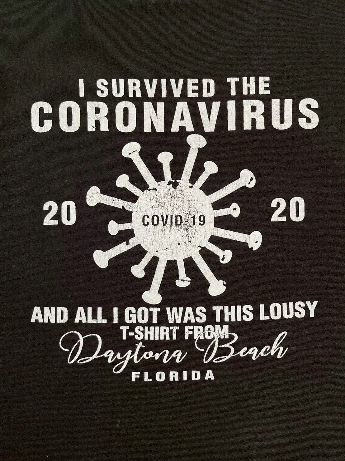 フロントとバックに「I SURVIVED THE CORONAVIRUS 2020 AND ALL I GOT WAS THIS LOUSY T-SHIRT FROM Daytona Beach FLORIDA(コロナウイルスを生き延びた 2020年 そして手に入れたのはこのしょぼいTシャツだけ)」というフレーズがプリントされています