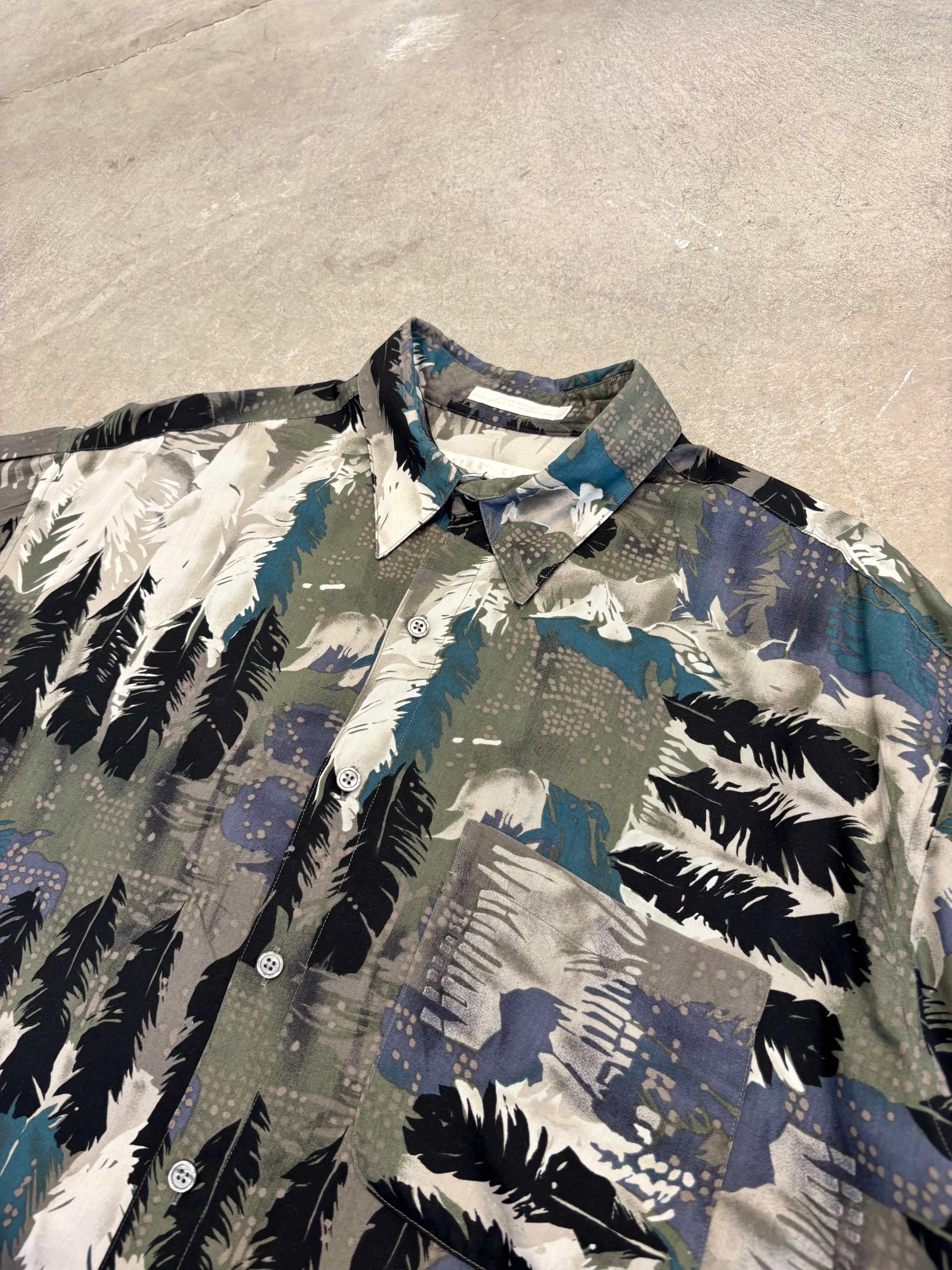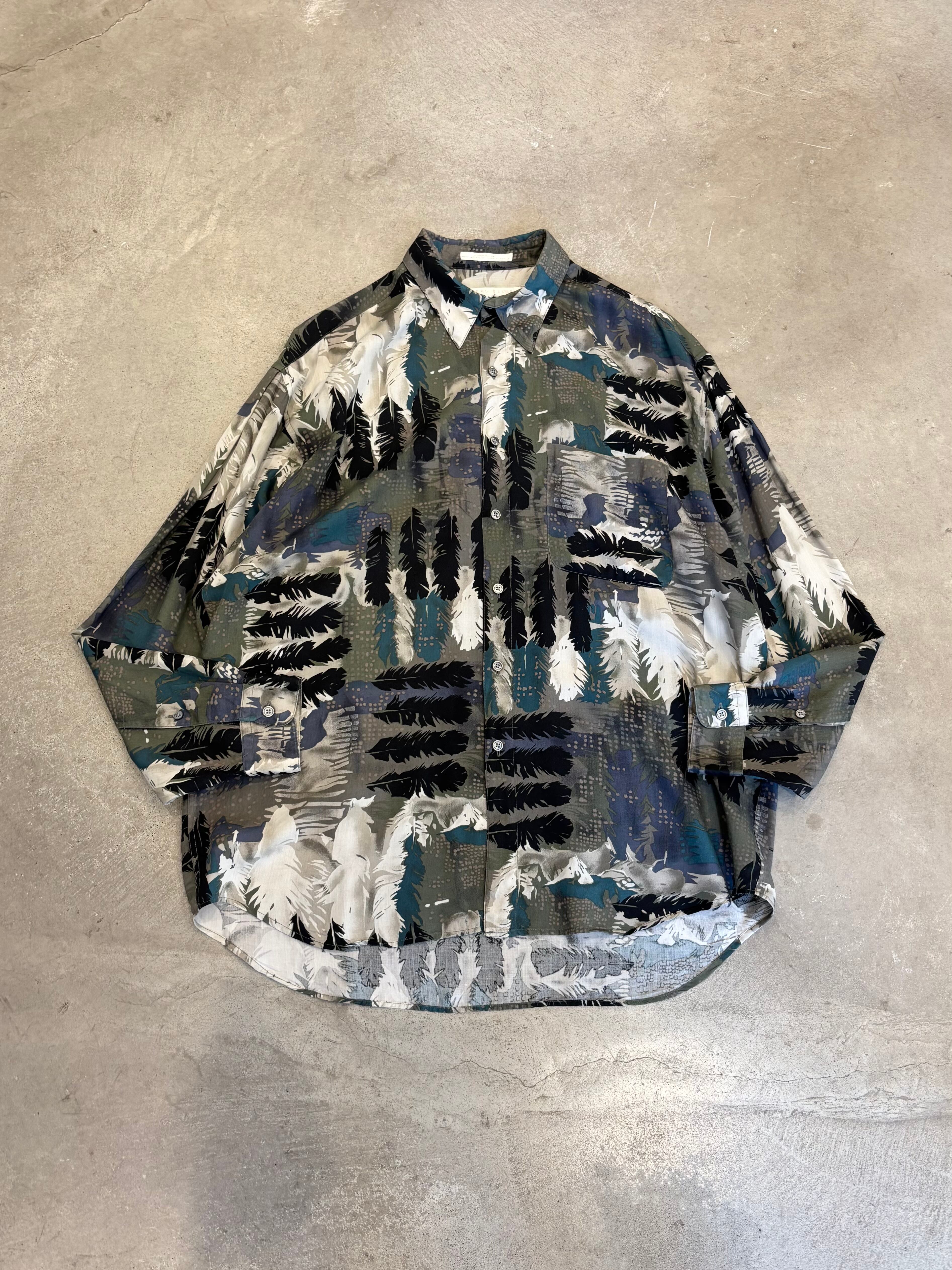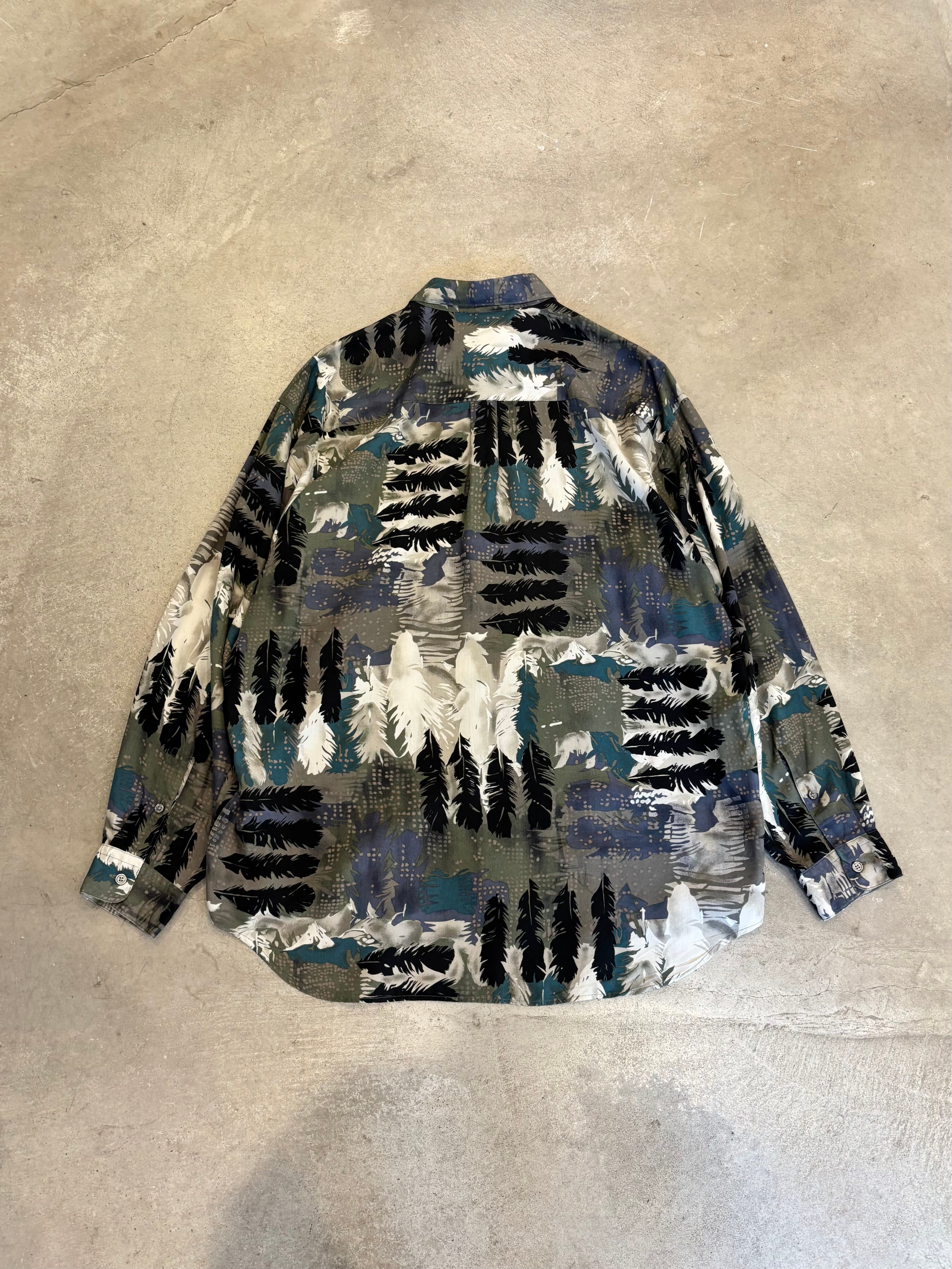 90s ”PERRY ELLIS“ L/S Feather Pattern Rayon Shirt MADE IN USA