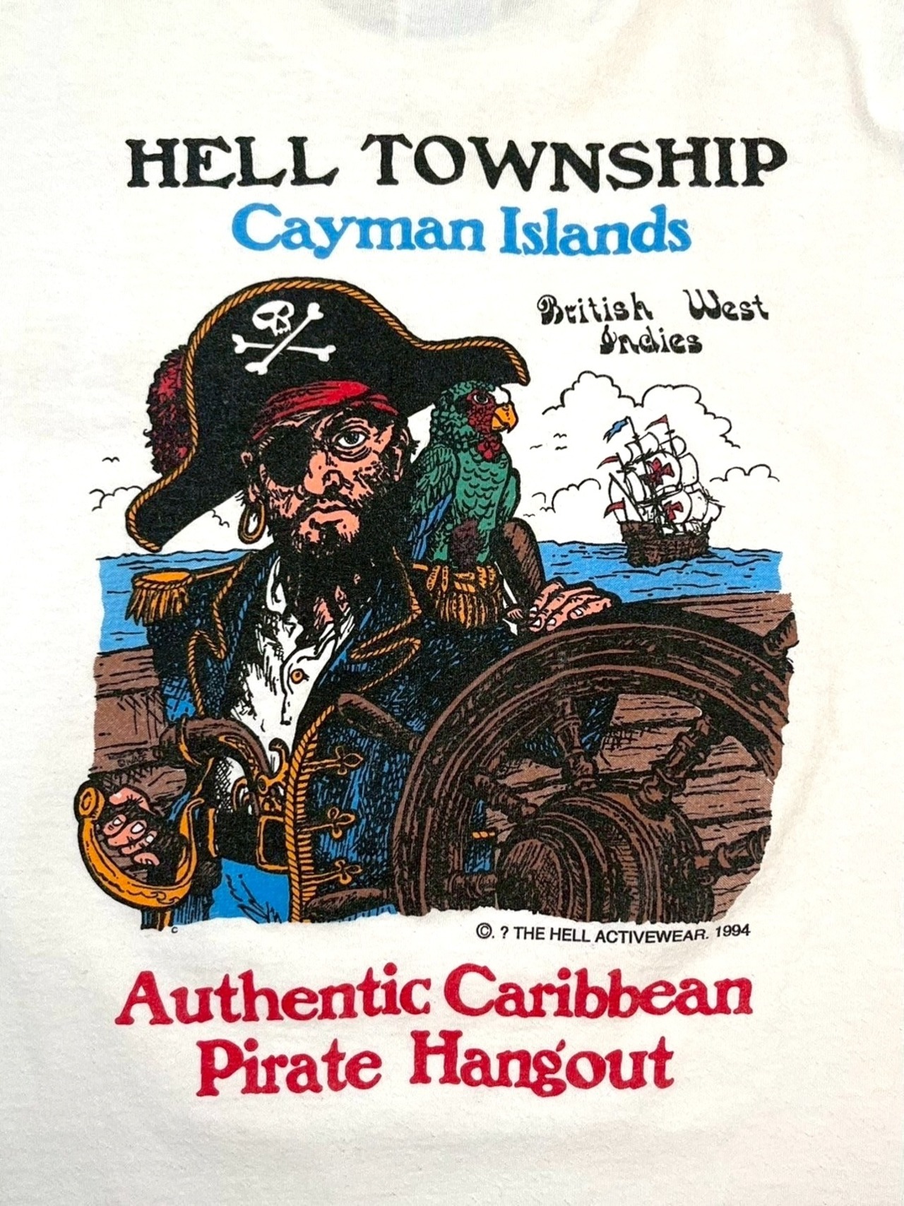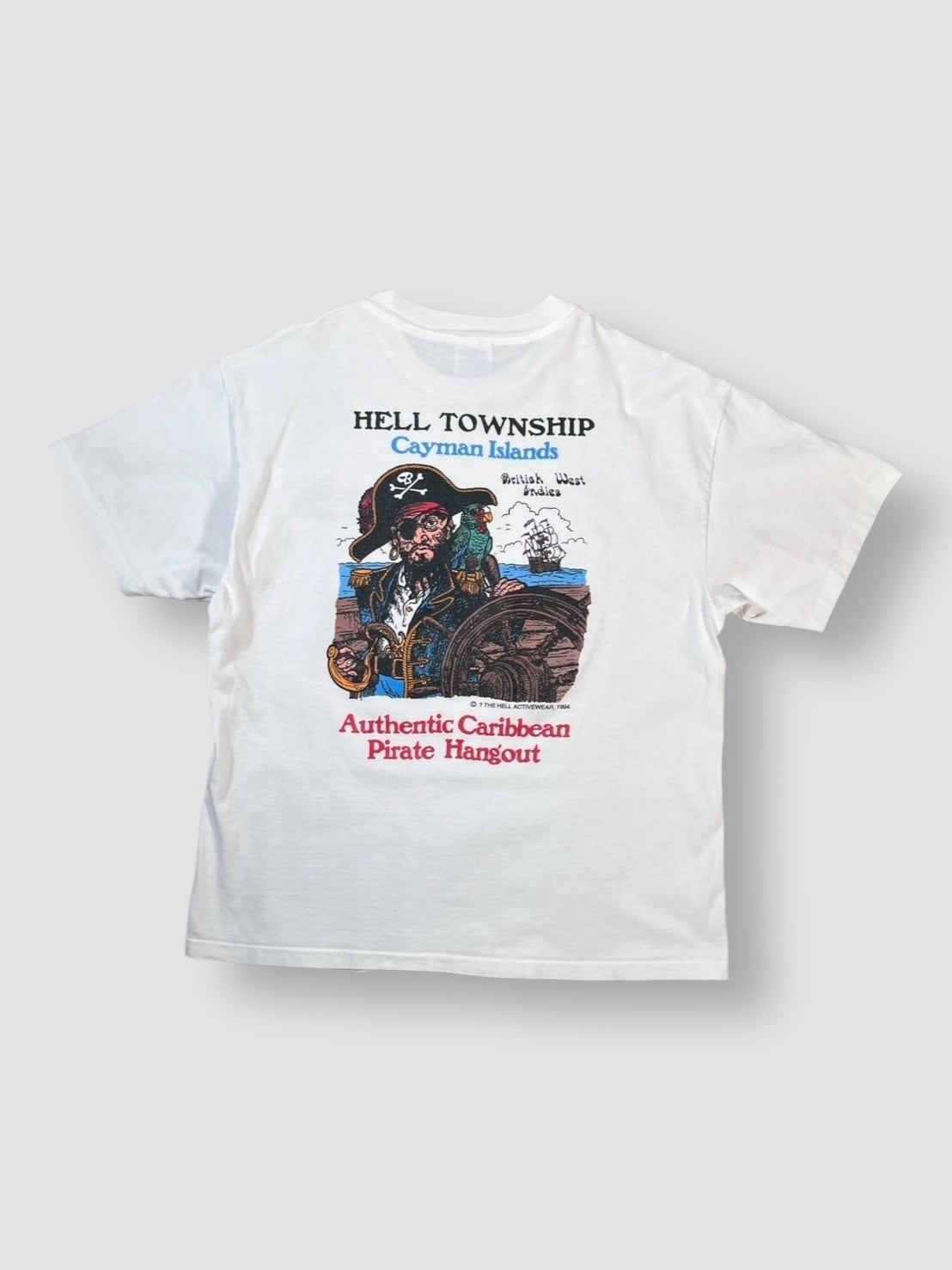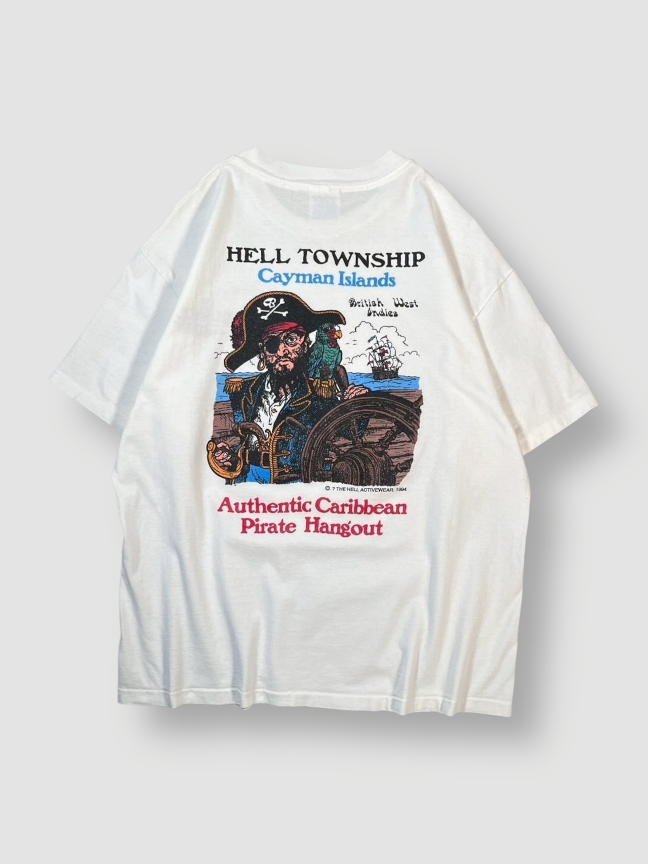 カリブ海のケイマン諸島にある観光地「HELL TOWNSHIP」をモチーフにしたデザインで、フロント胸元にブランドロゴ、バックに海賊とオウムのグラフィックが大胆にプリントされています