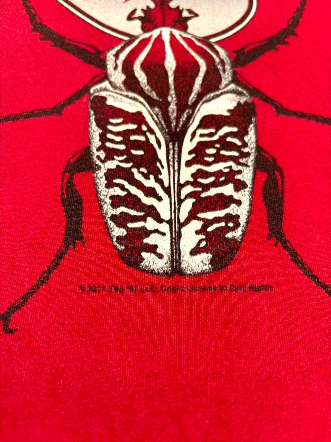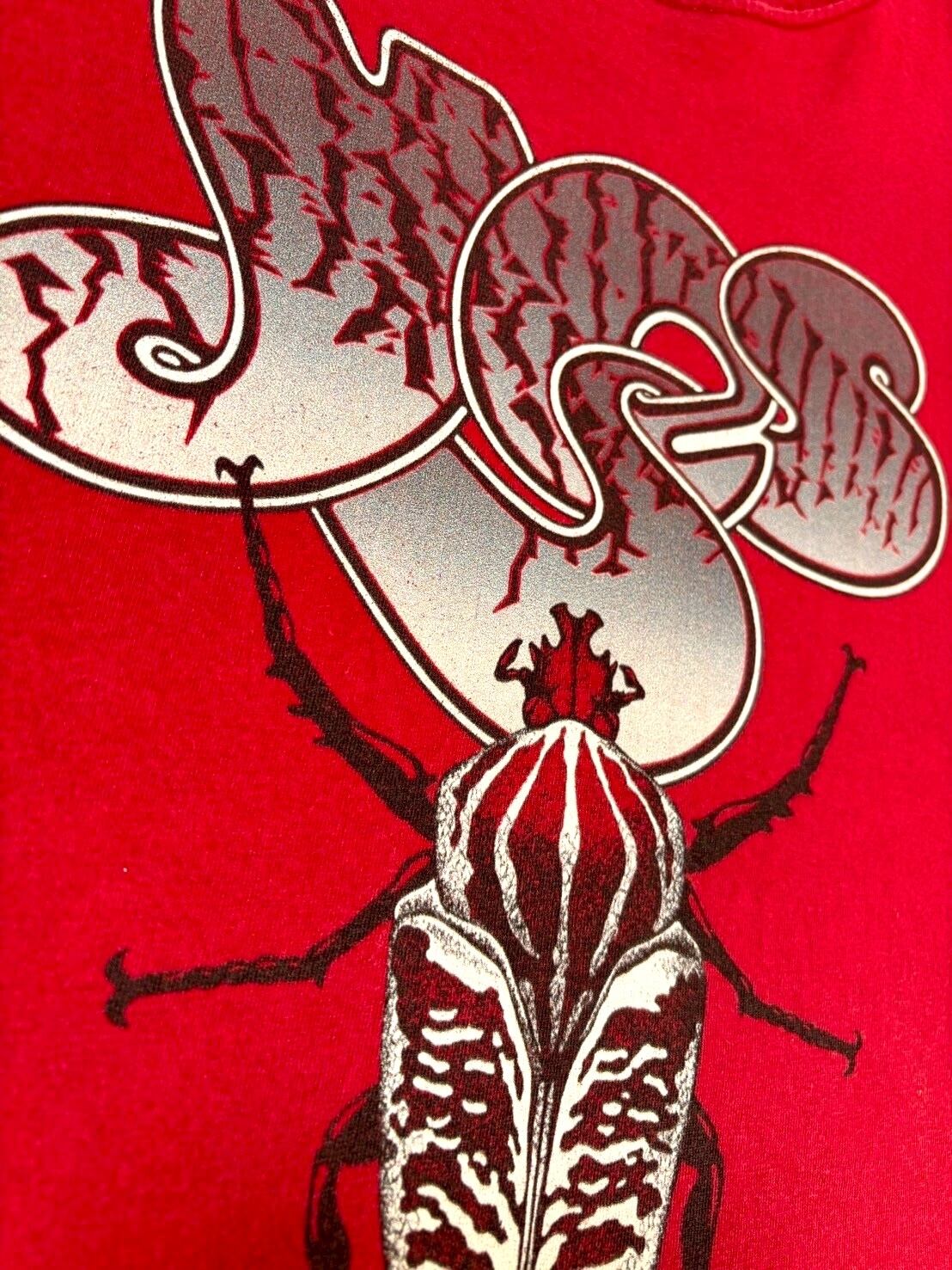 ワインレッドボディに大きくバンドロゴが入り、甲虫が描かれたインパクトあるグラフィックです