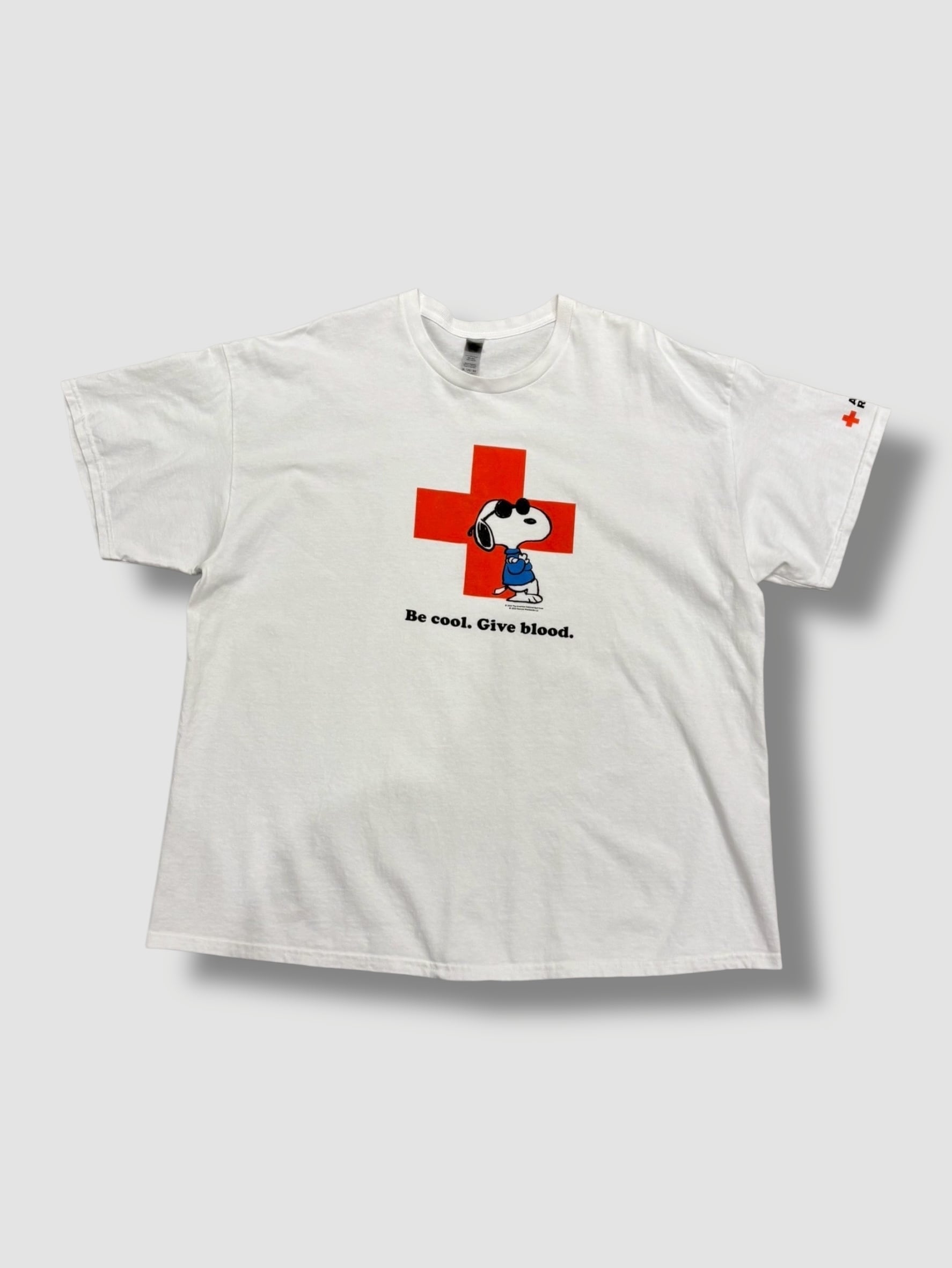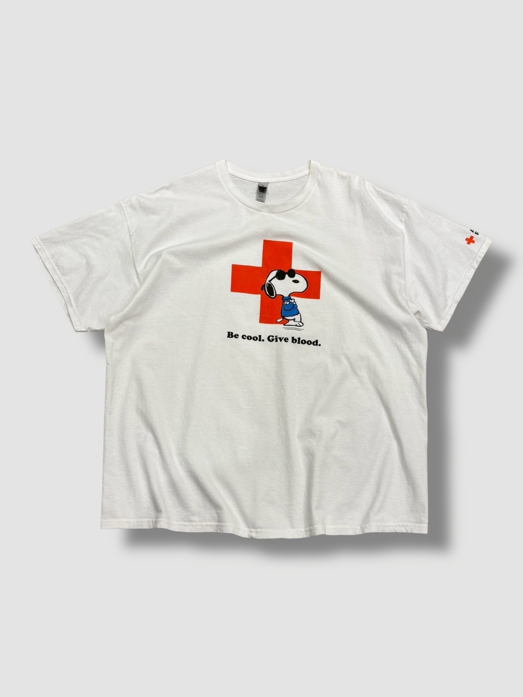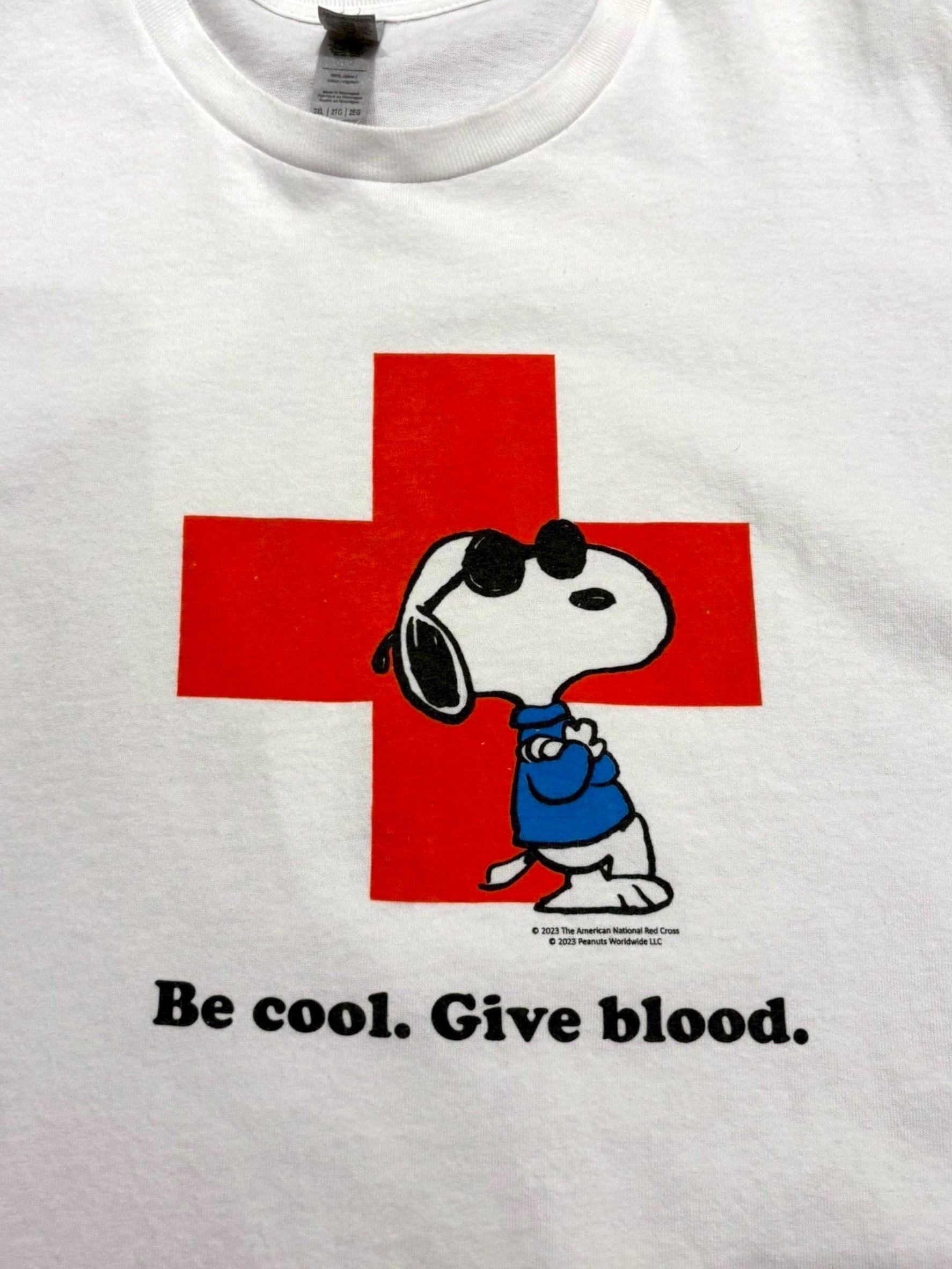 アメリカン・レッドクロスとPEANUTSのチャリティーモチーフで、フロントには「Be cool. Give blood.(クールになろう 献血しよう)」のコピーと赤十字に寄りかかるJoe Coolのプリント
