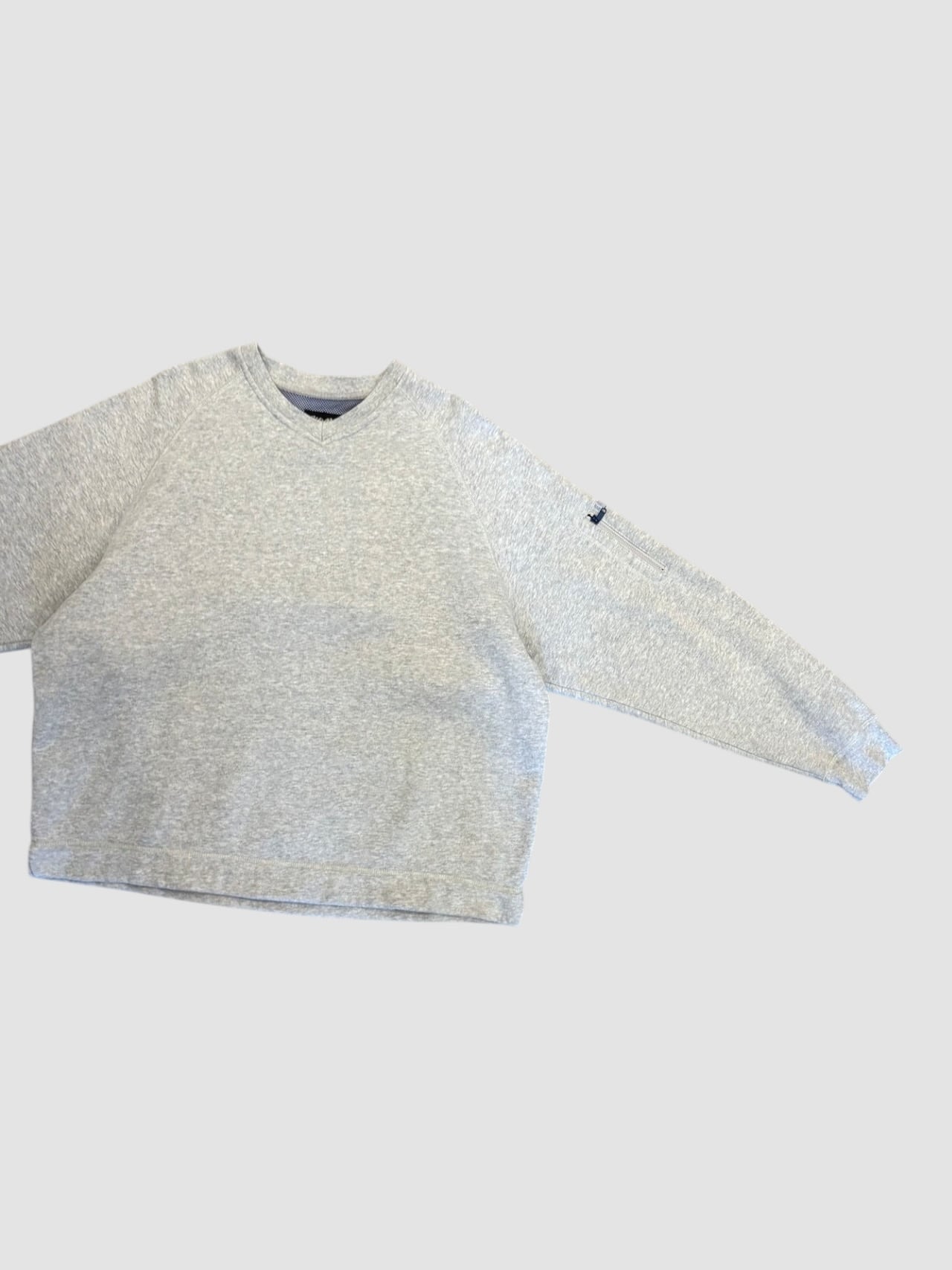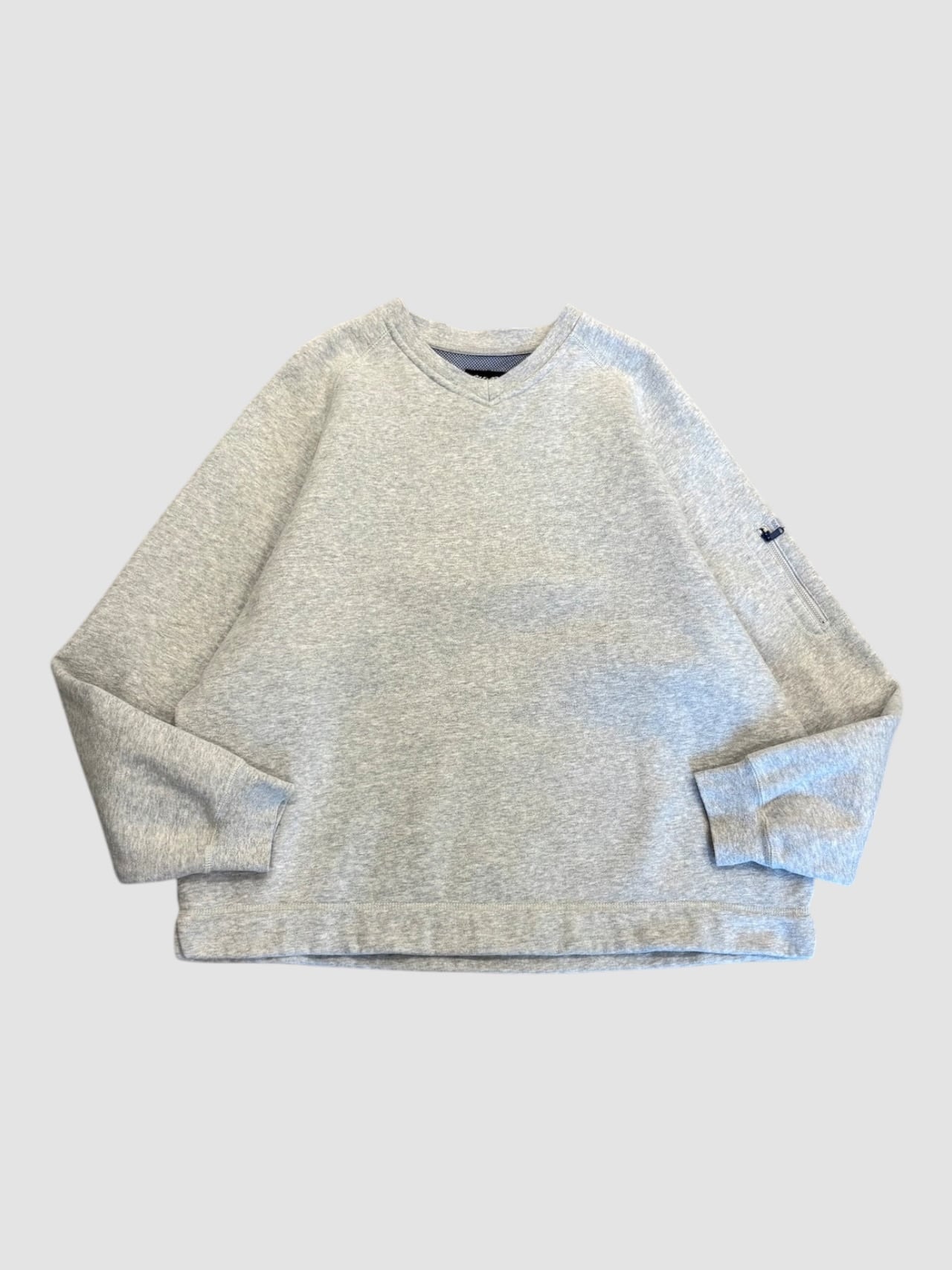 無地ですが、Vネック、裾リブなし、袖ポケットなど気の利いたディテールが盛り込まれた1着