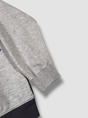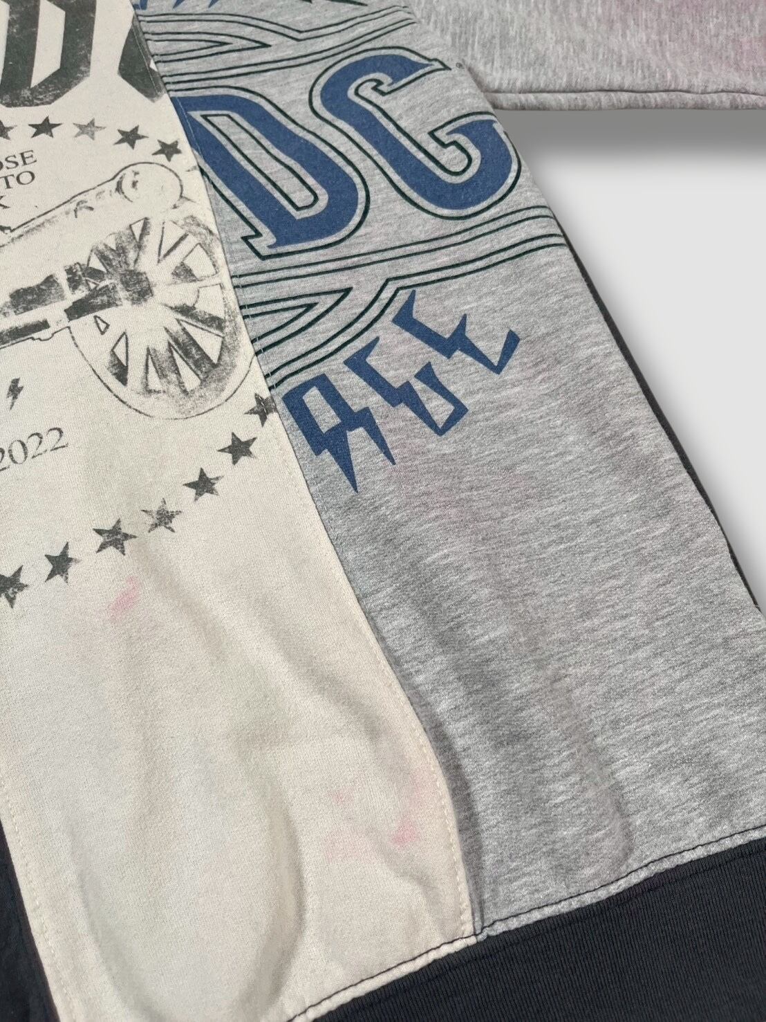 様々なデザインのスウェットが繋ぎ合わさったデザインが目を引く1着