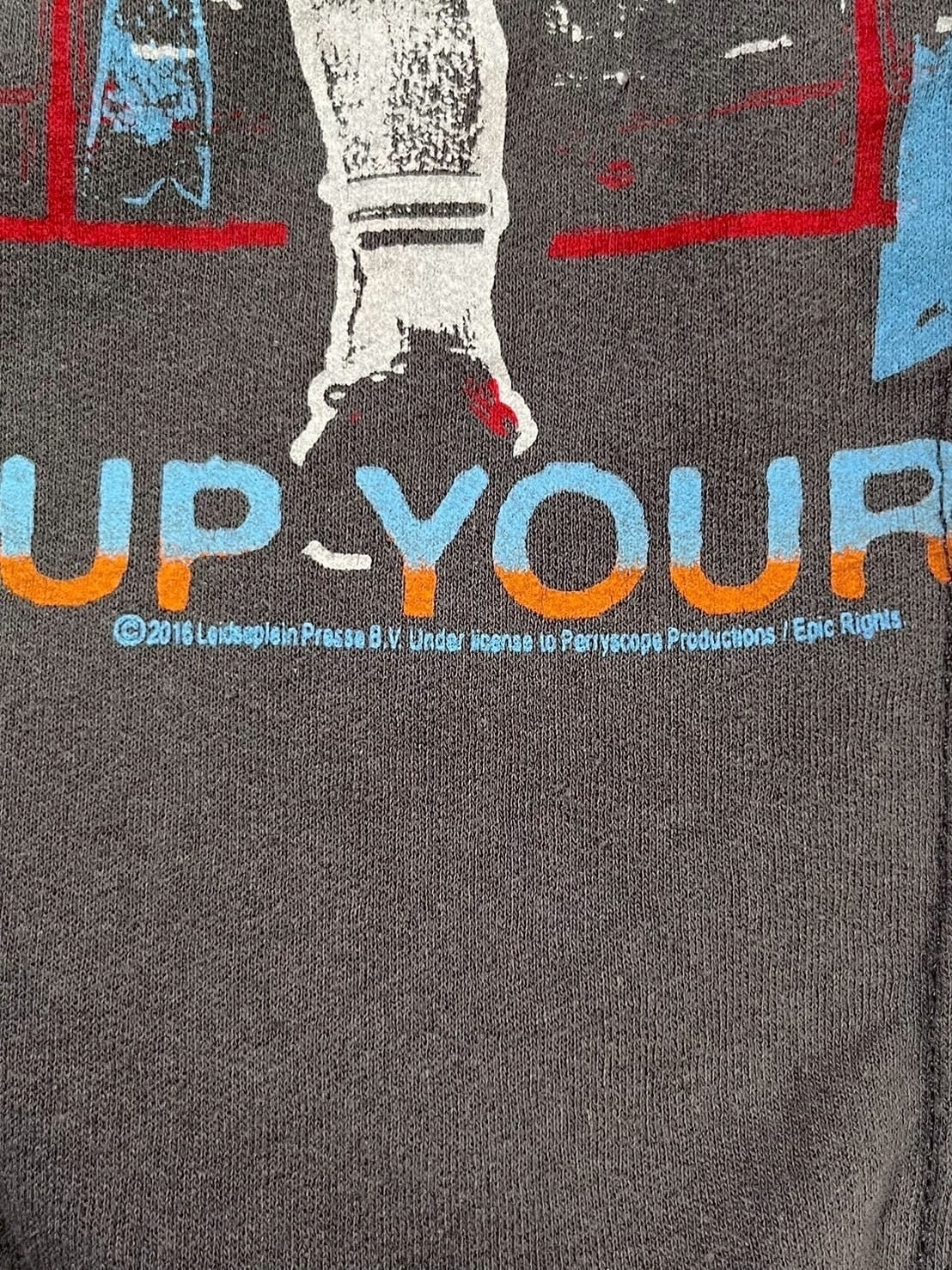 フロントのプリント上あたり、左袖に色移りあり