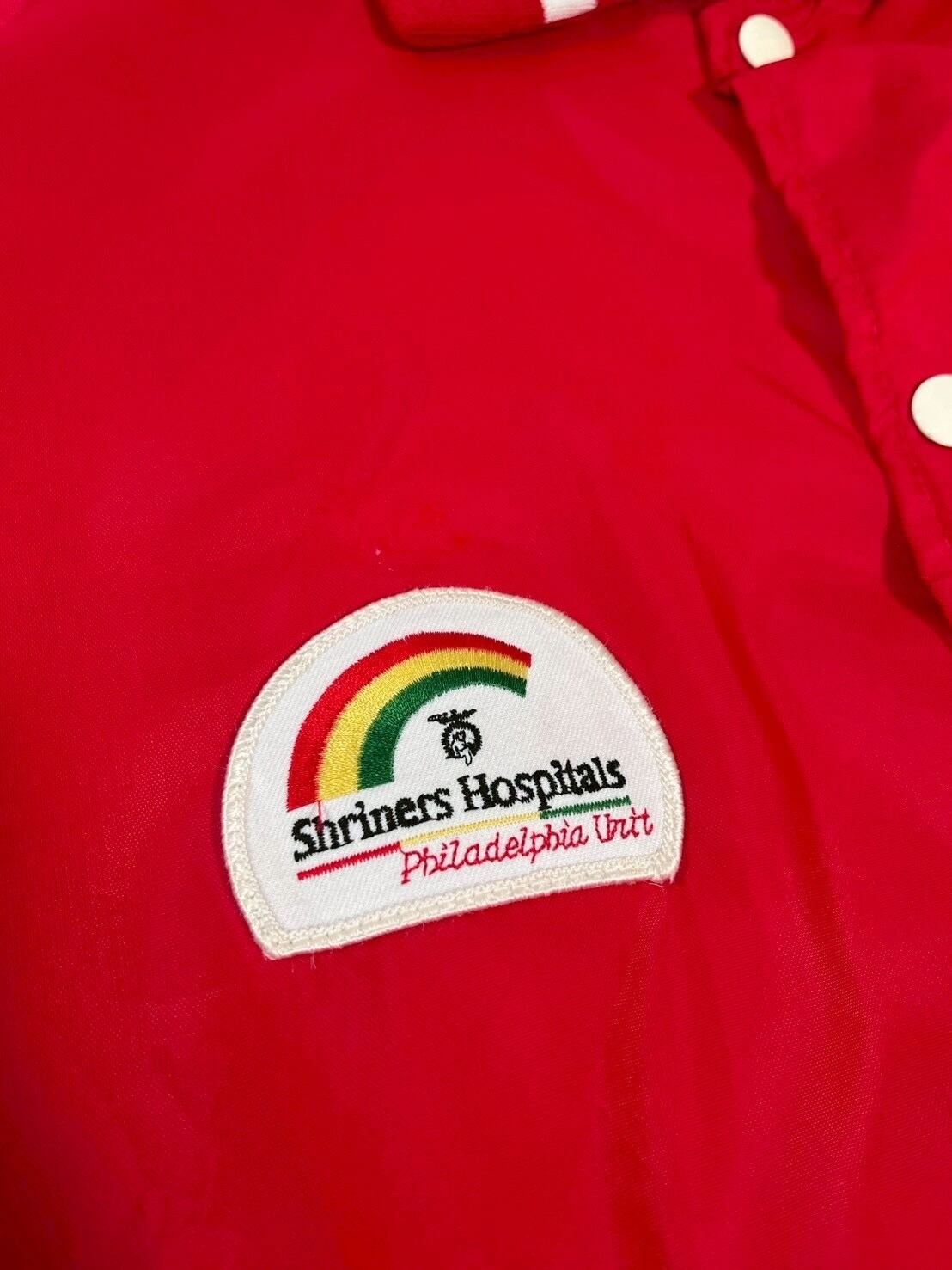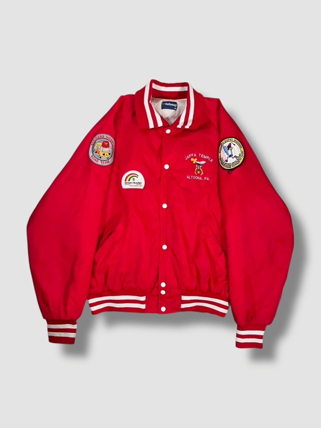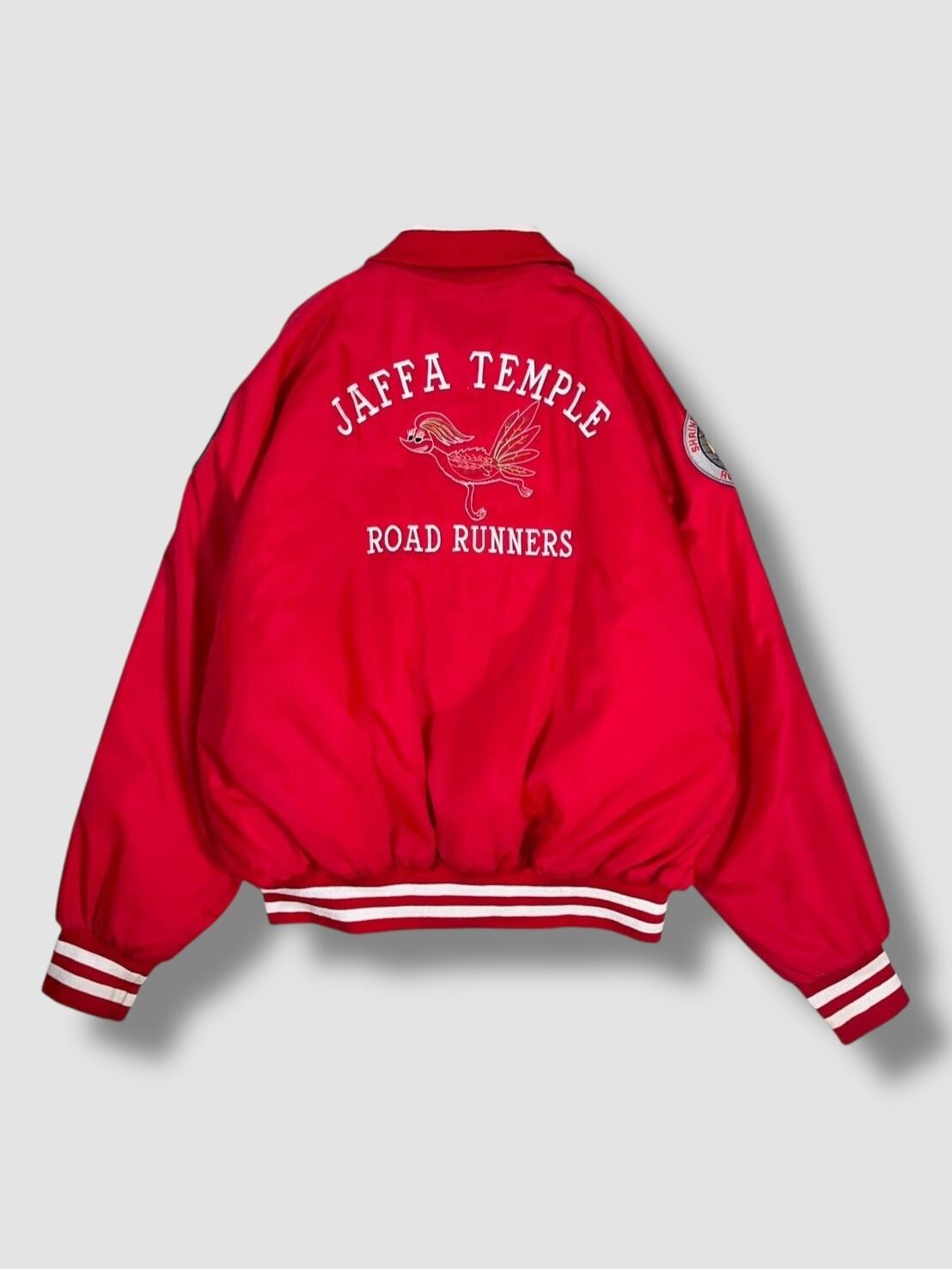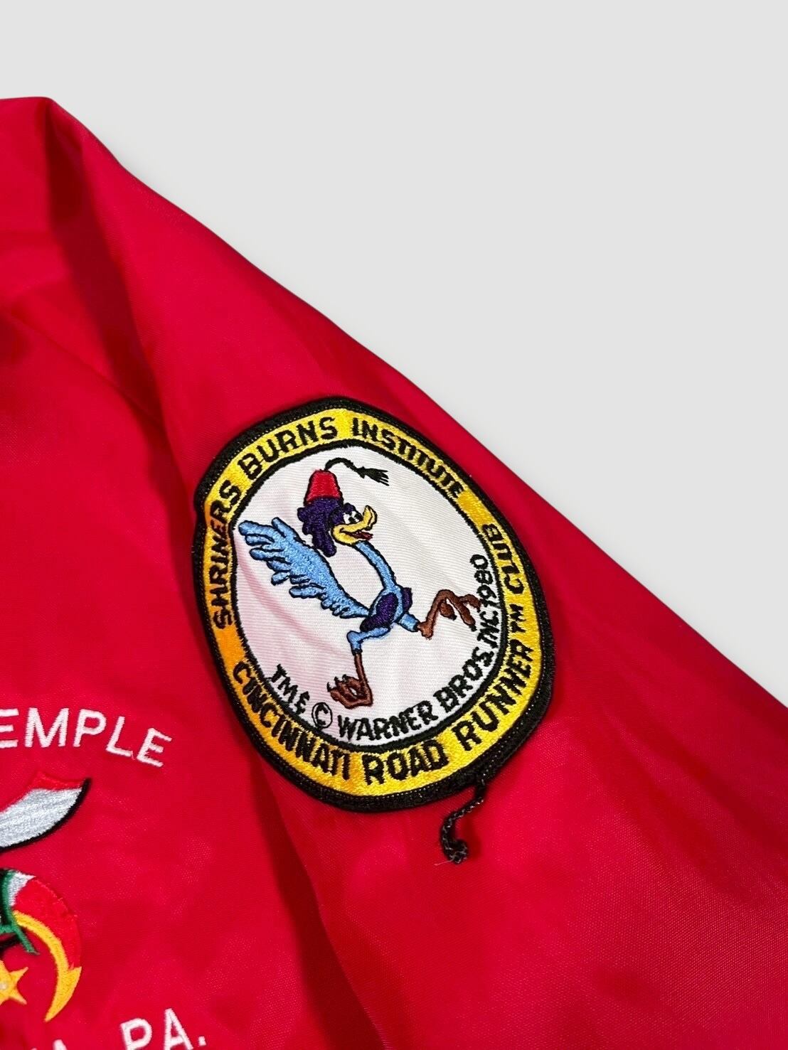 背面にはロードランナーの刺繍、フロントにはShriners HospitalsやWarner Bros. ロードランナーのワッペンが配置された1着です
