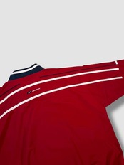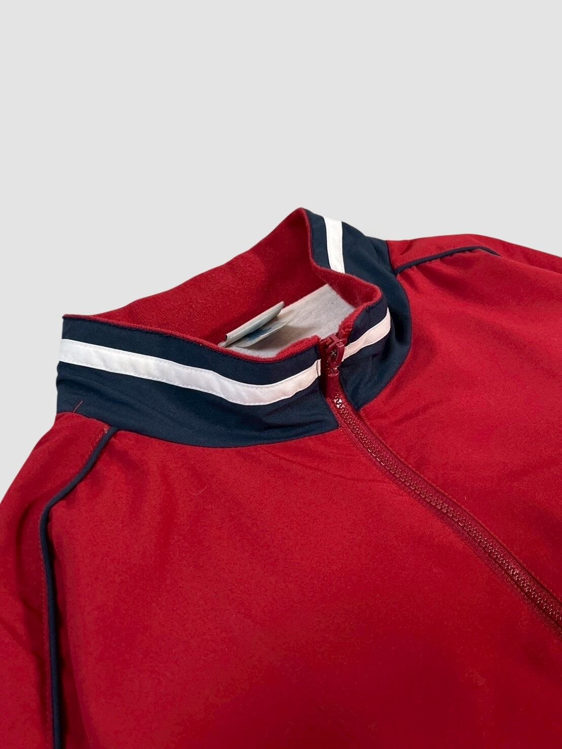 落ち着いたレッドにネイビーとホワイトのラインが映えるカラーリングで、胸元とバックにブランドロゴ刺繍入りのデザイン