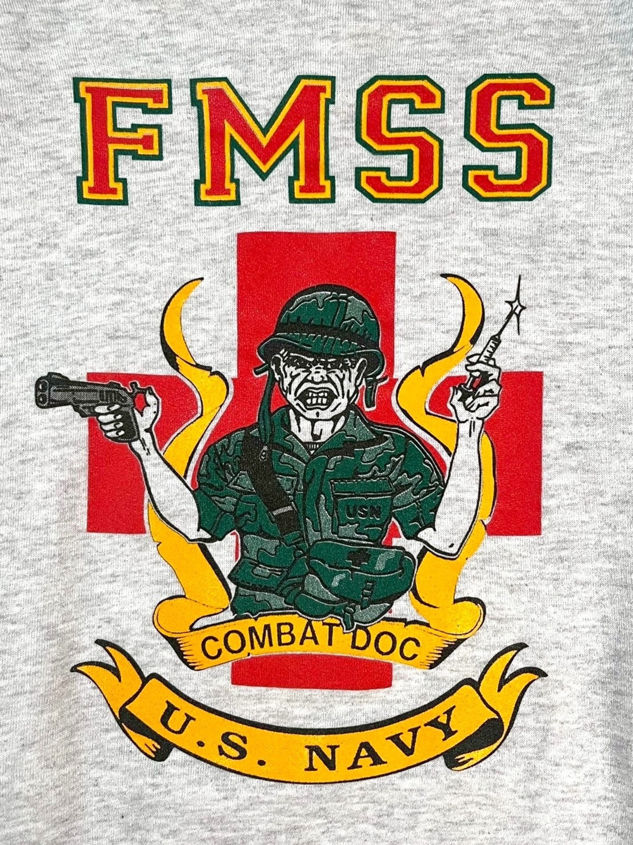フロントにはUSNとUSMCのチームロゴ、バックには「COMBAT DOC」と称された戦場医療兵をモチーフにしたグラフィックが大判でプリントされたインパクトある1着