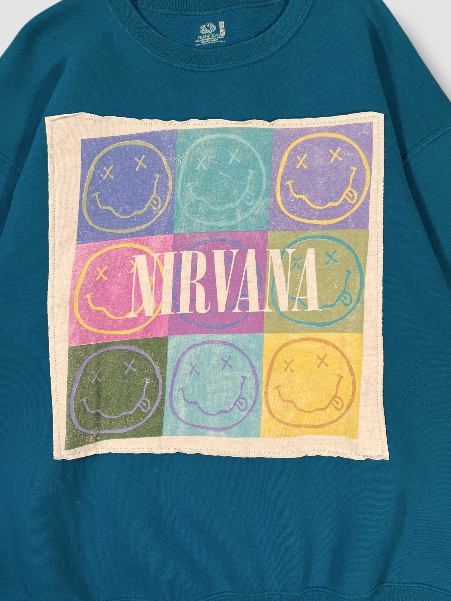 こちらは90年代のグランジ、オルタナを代表するバンドのひとつ、ニルヴァーナのプリント お馴染みのスマイリーロゴがアンディー・ウォーホル風にデフォルメされたデザインです