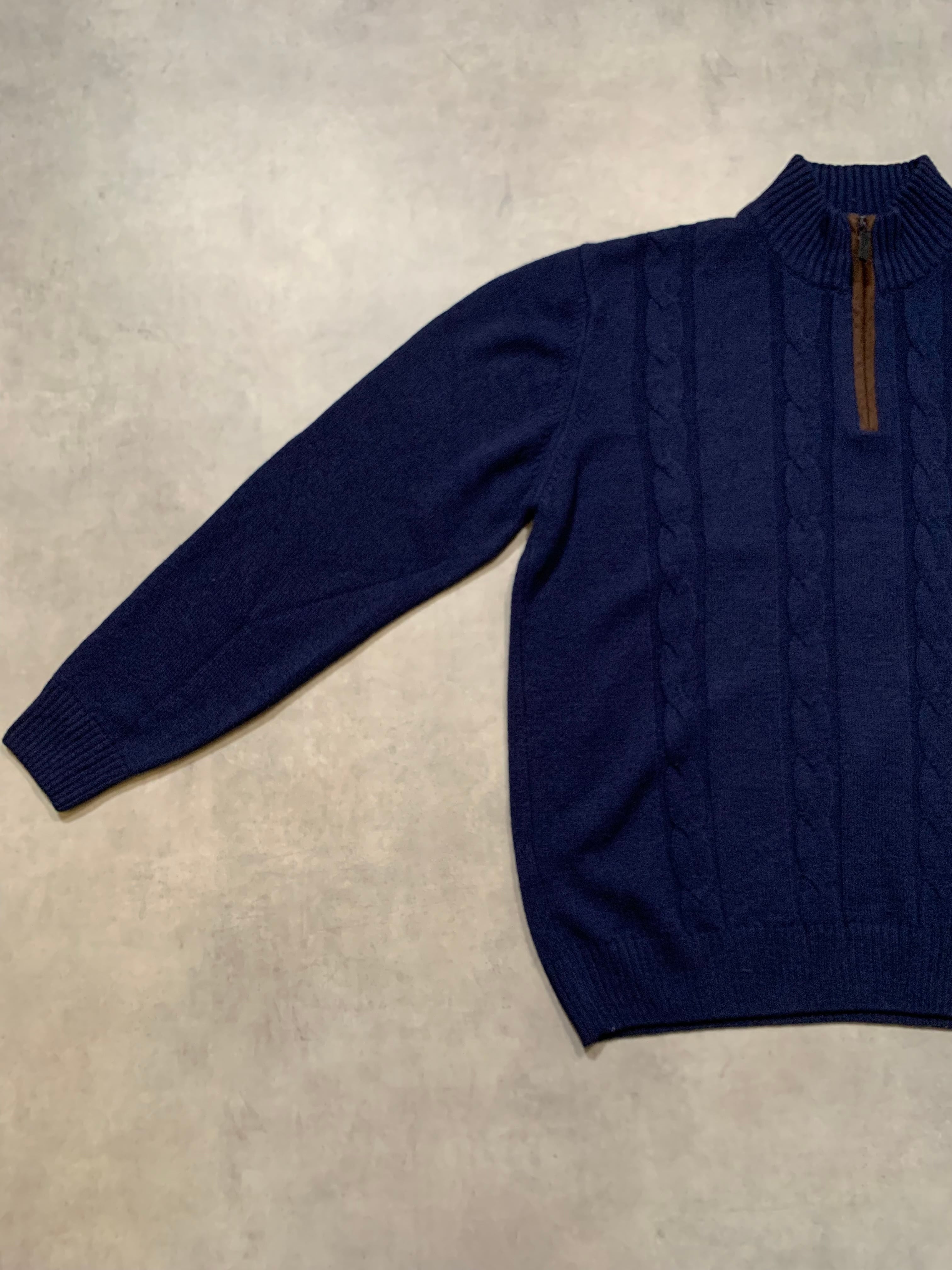 こちらはハーフジップ仕様のニットでフロントにはケーブル編みを配しつつバックはプレーンな編地で切り替えられたデザイン