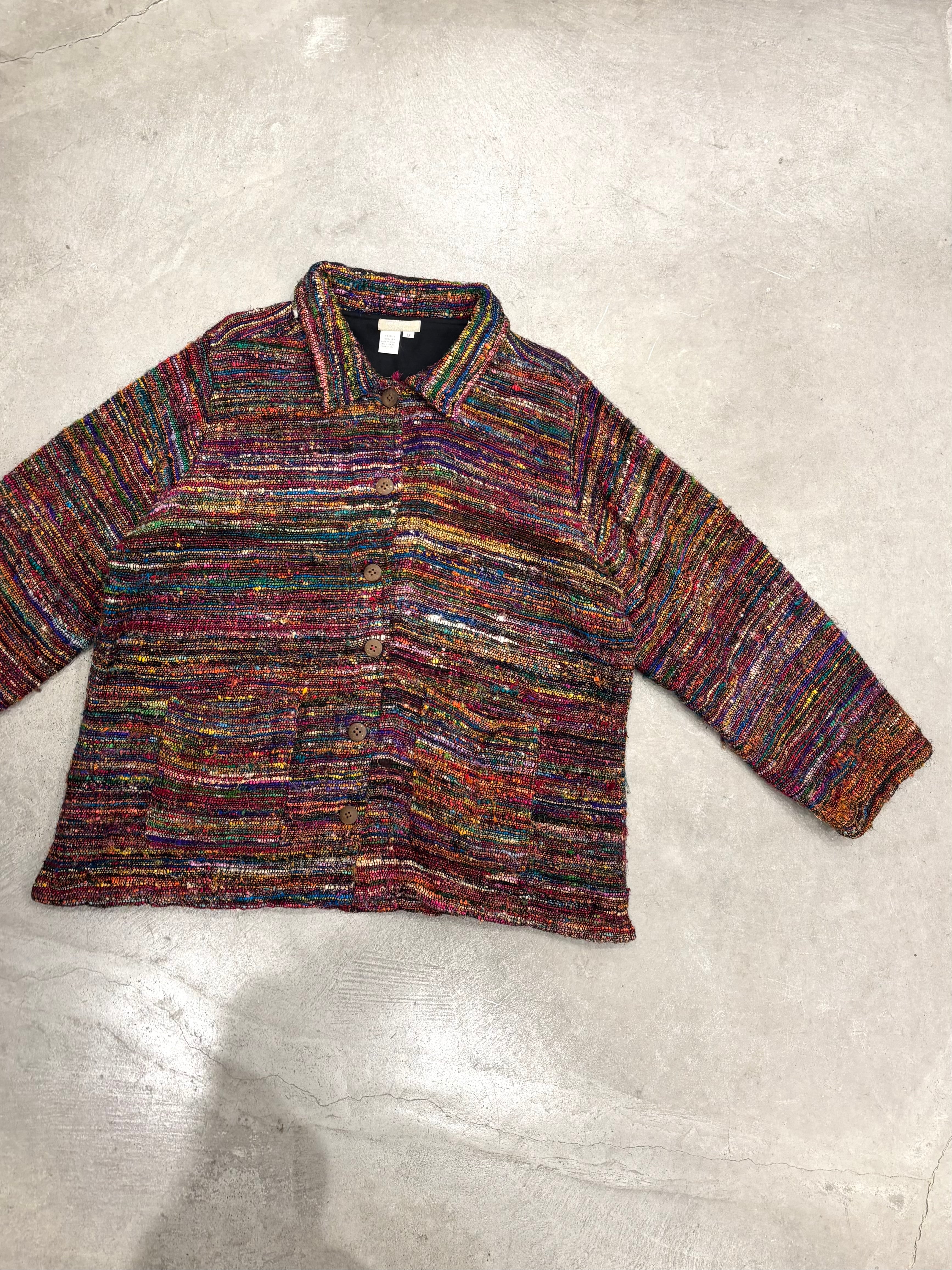ラグのような厚みのある生地感と鮮やかな配色が特徴的な1着