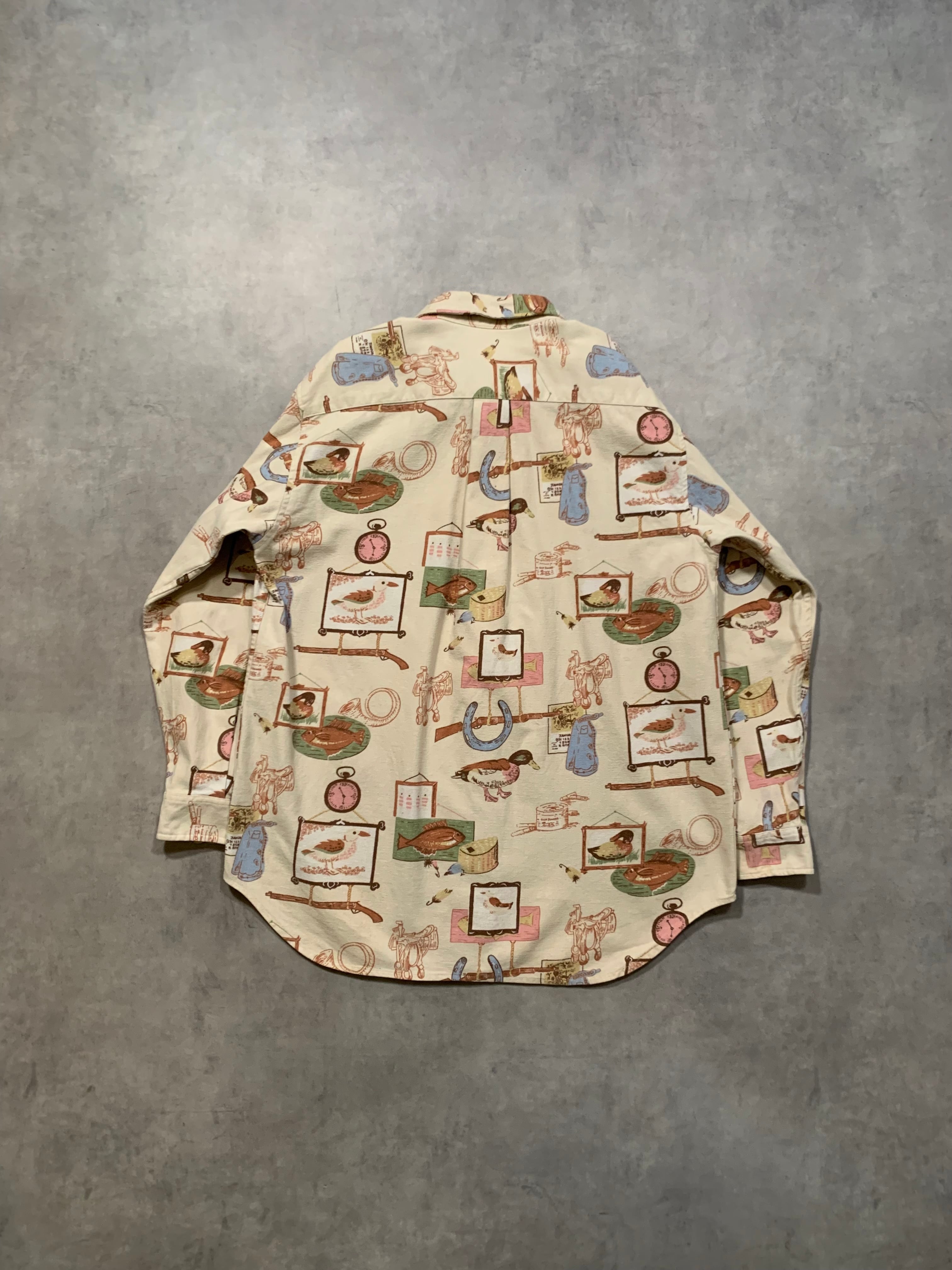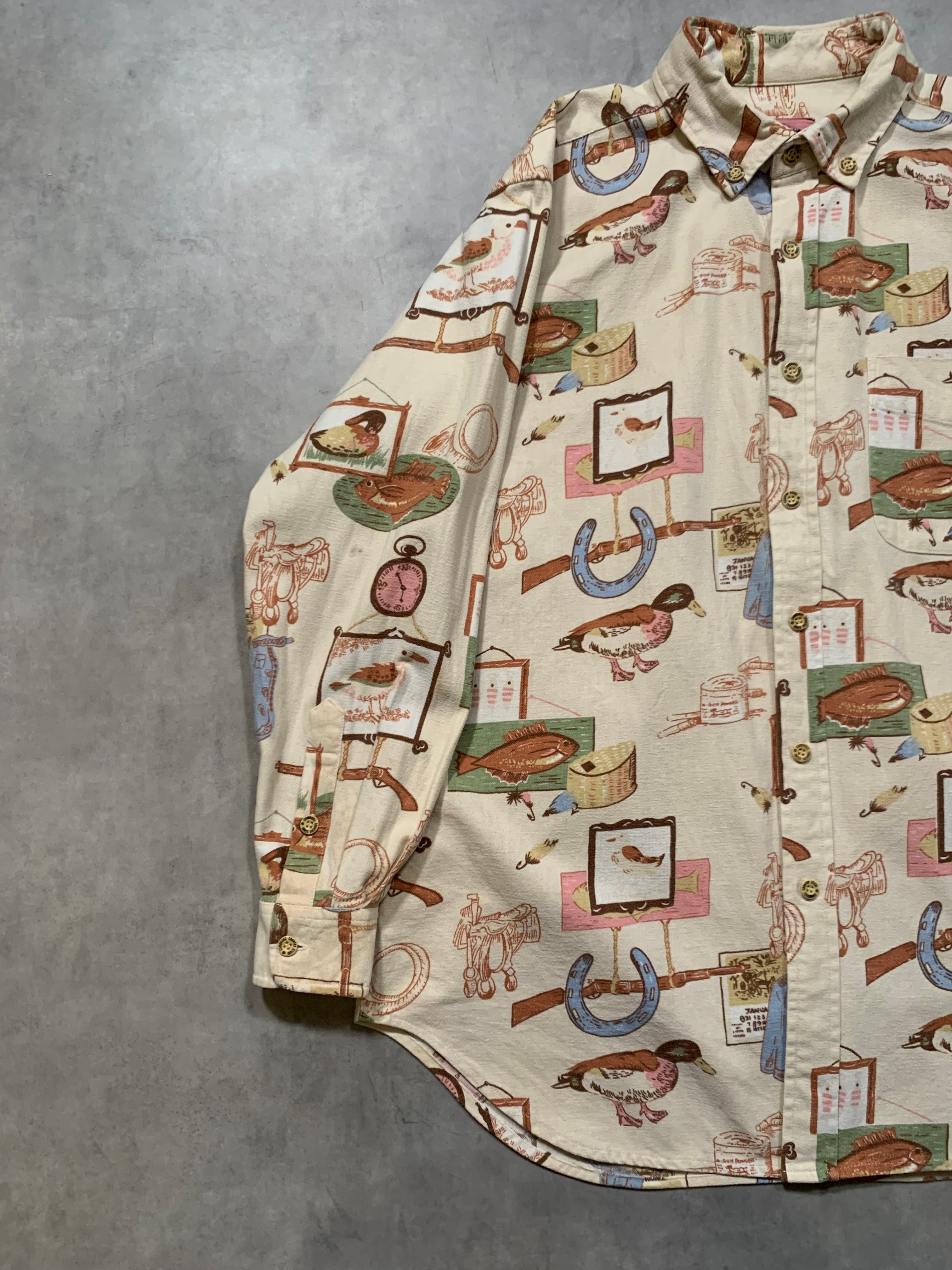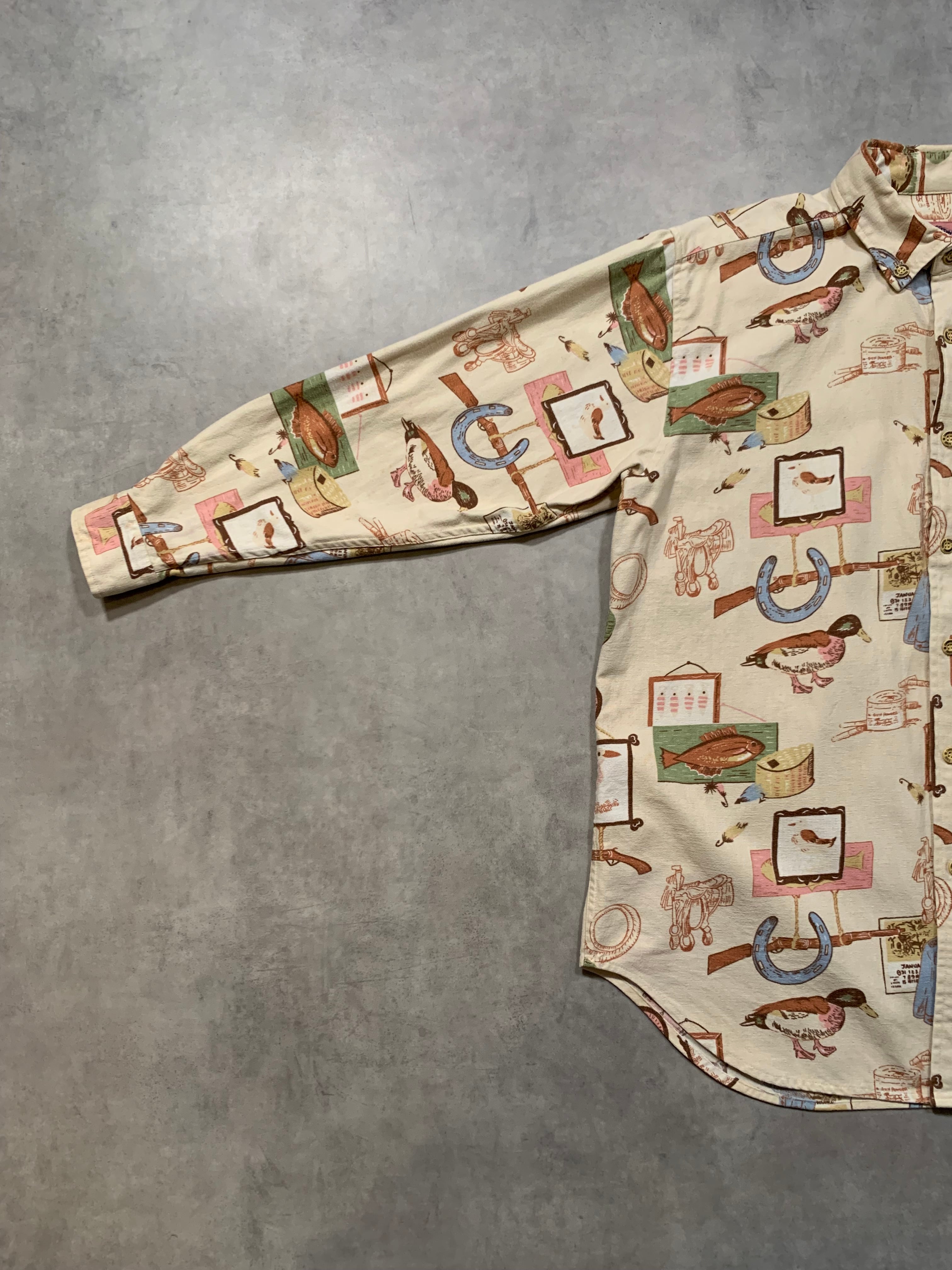 ハンティングやフィッシングをモチーフにした総柄デザインで鴨や魚、馬蹄、銃、ルアーなどが散りばめられた遊び心のある1着です