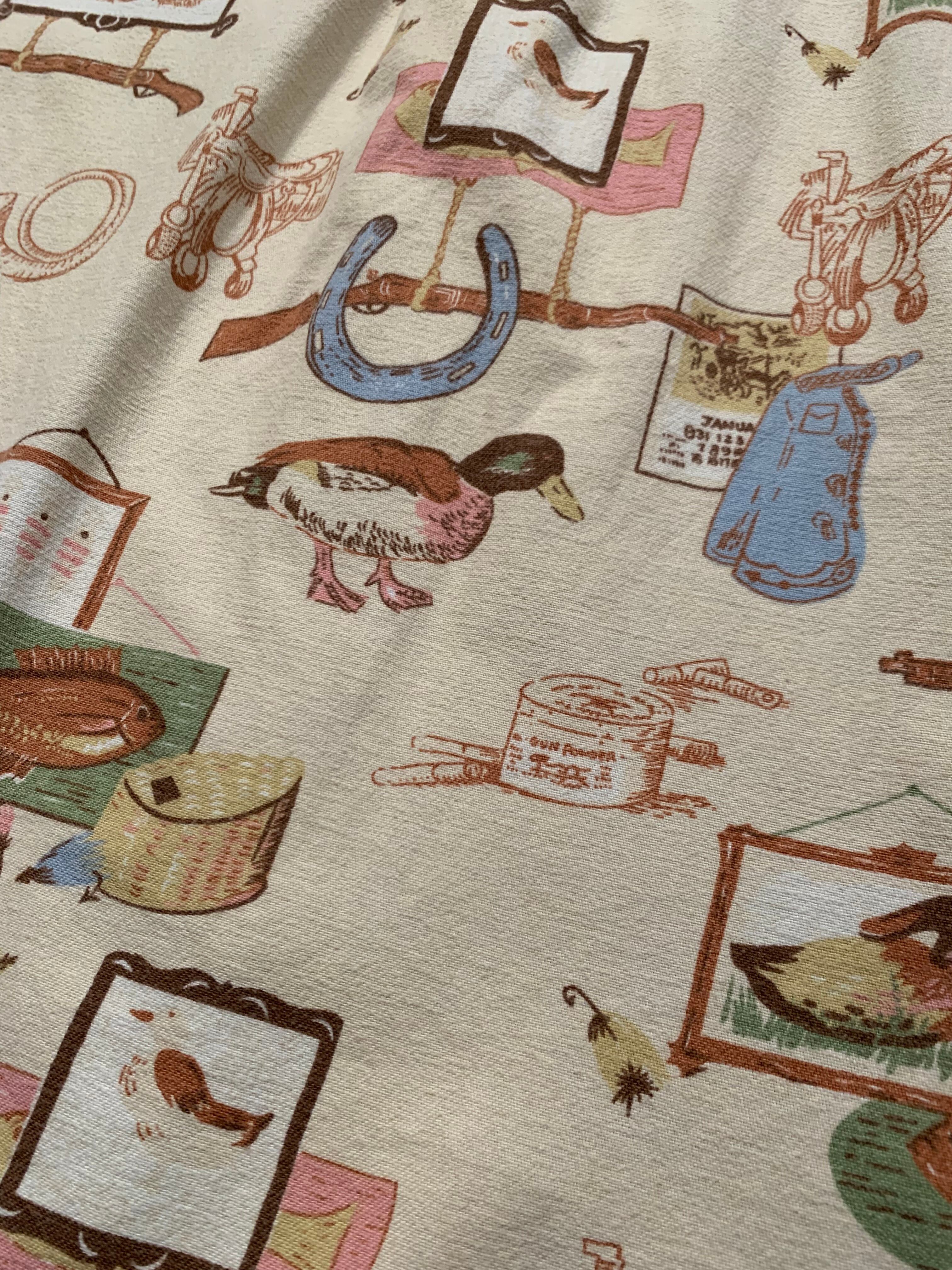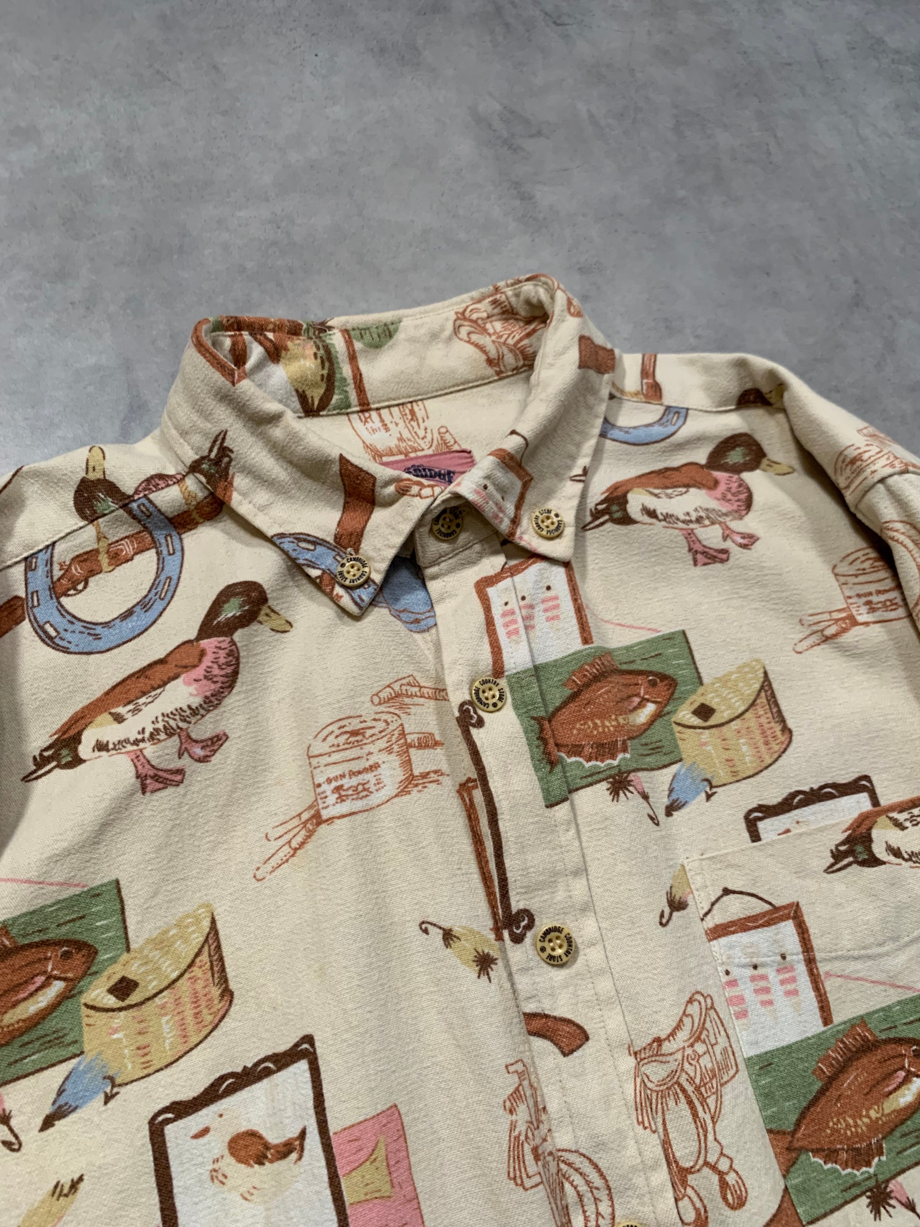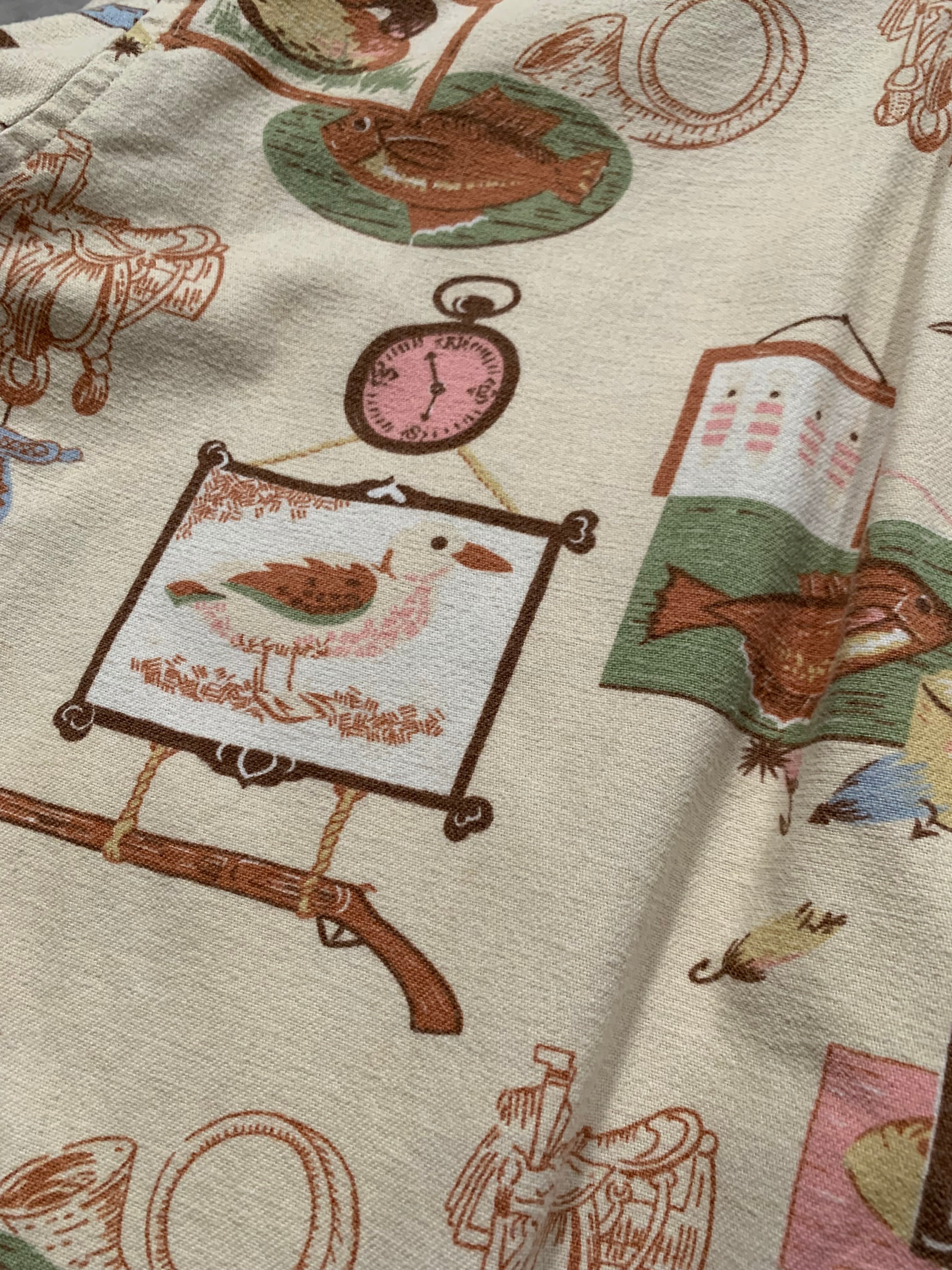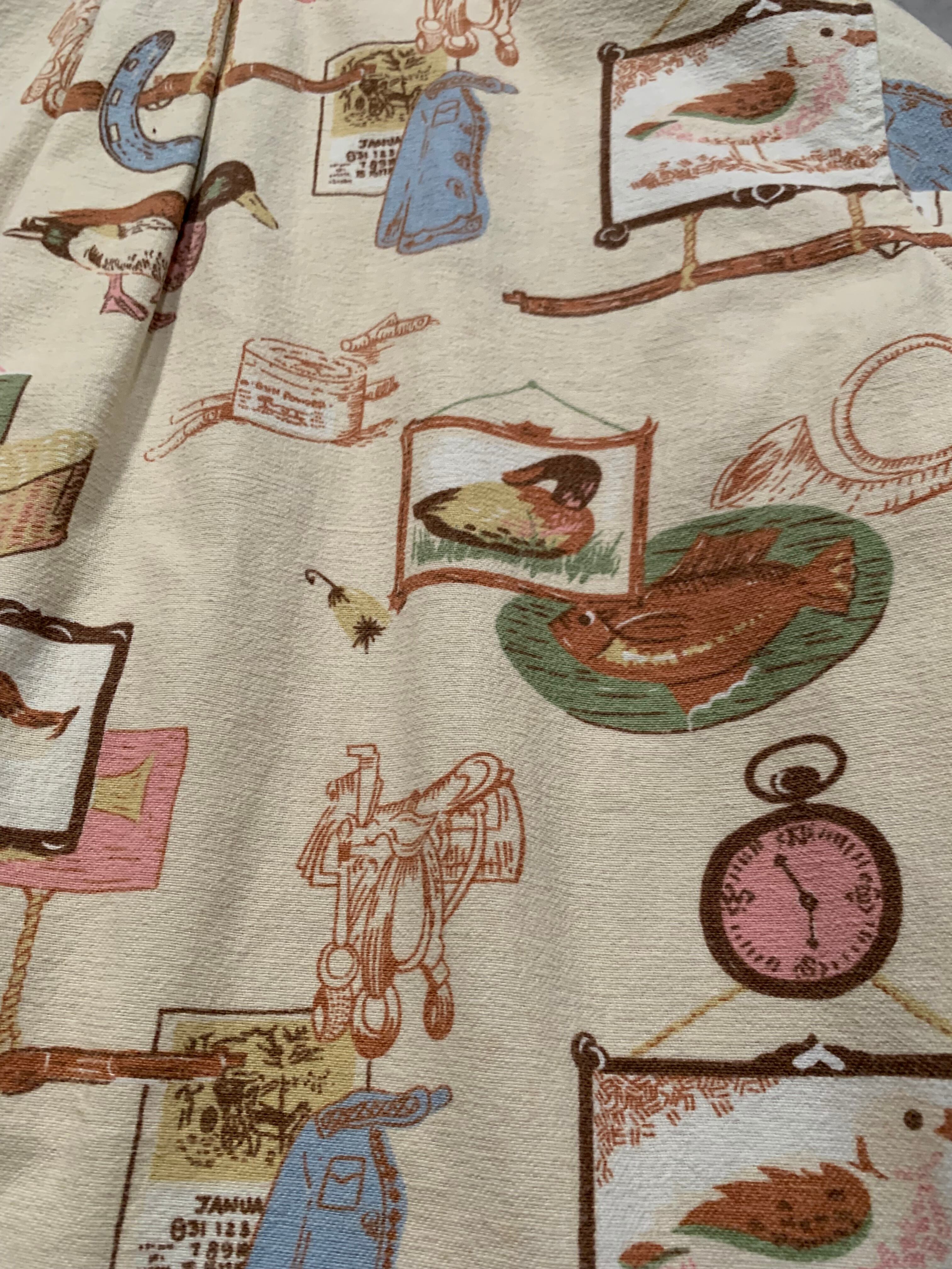 ハンティングやフィッシングをモチーフにした総柄デザインで鴨や魚、馬蹄、銃、ルアーなどが散りばめられた遊び心のある1着です