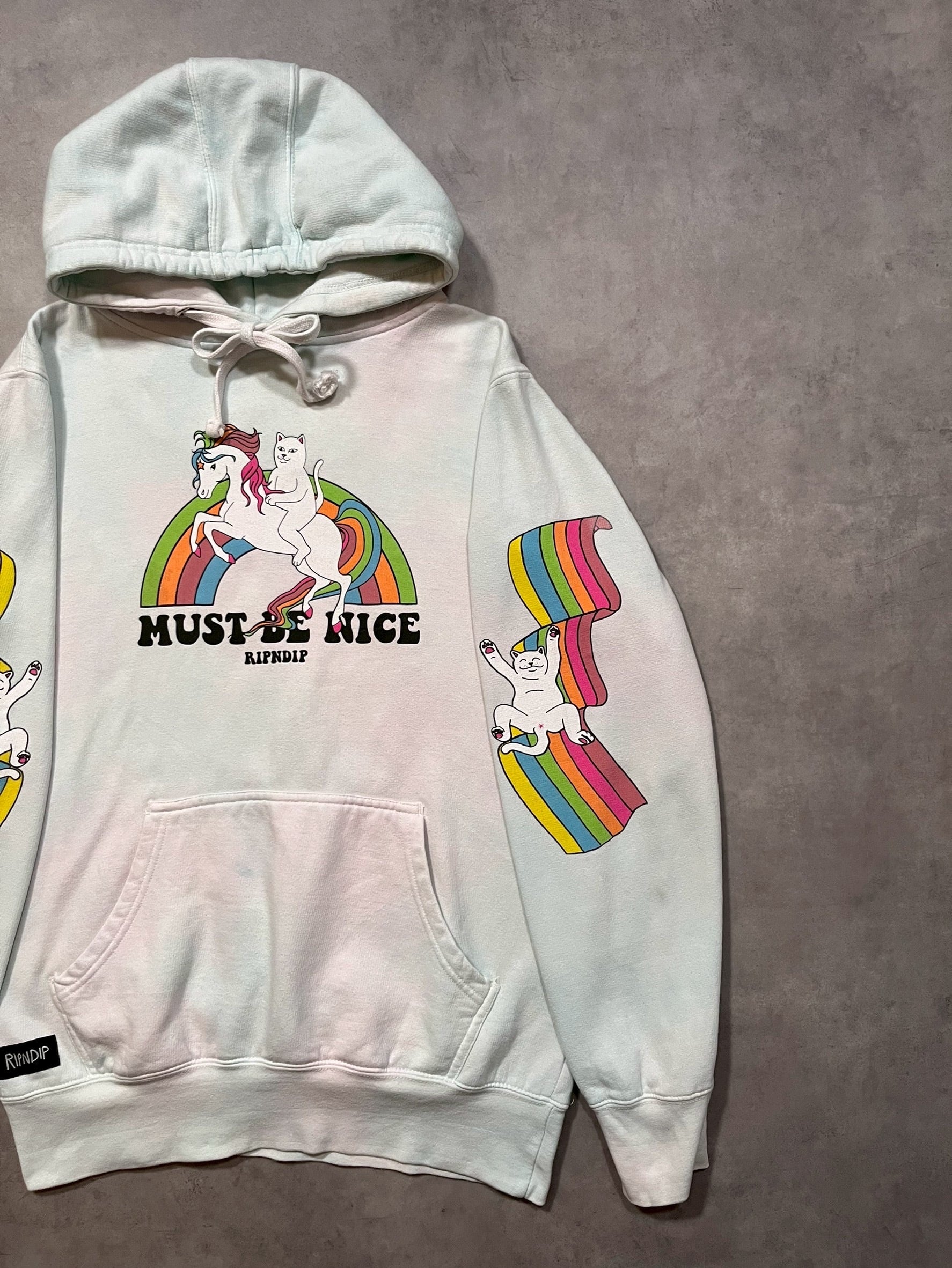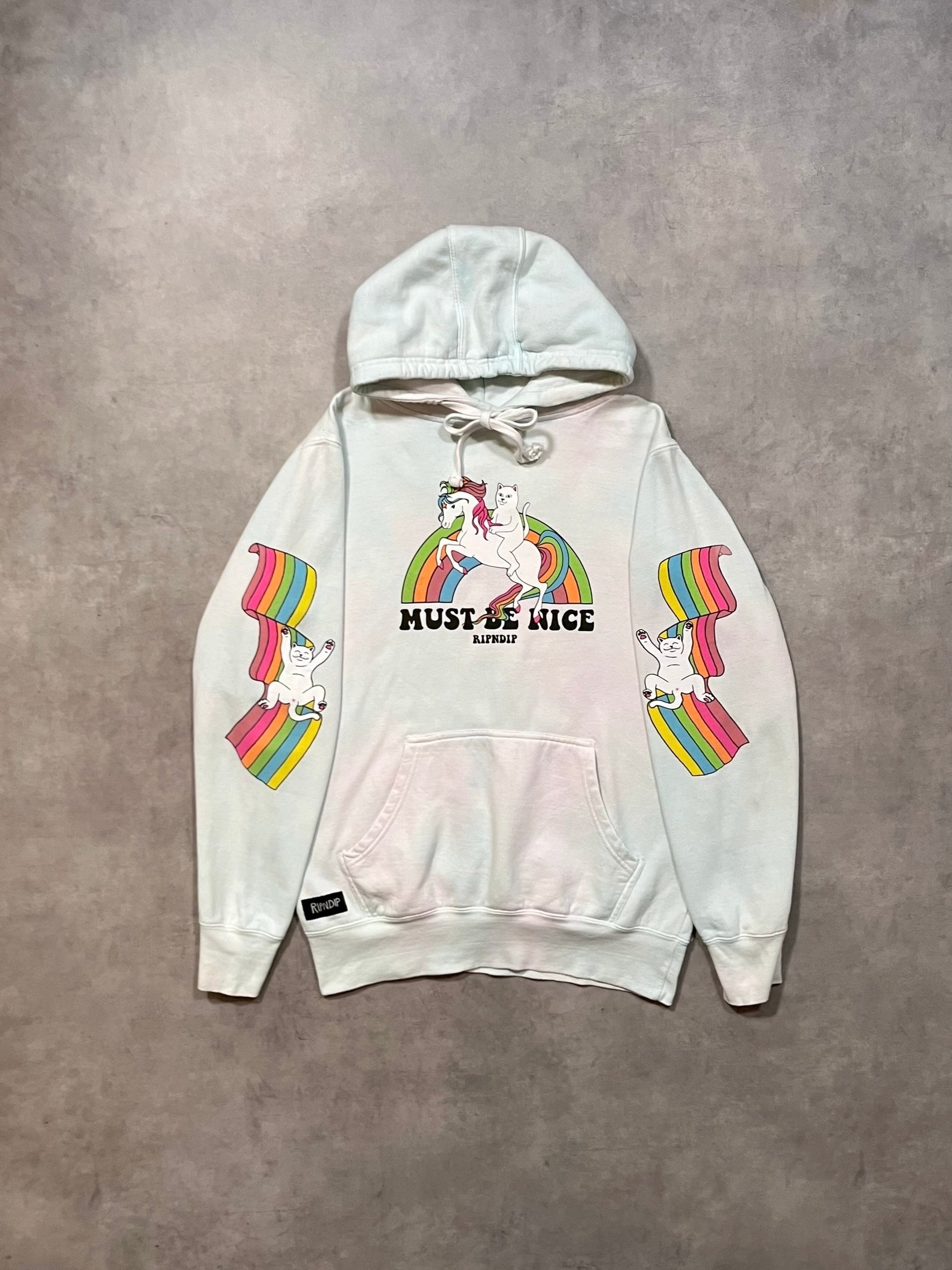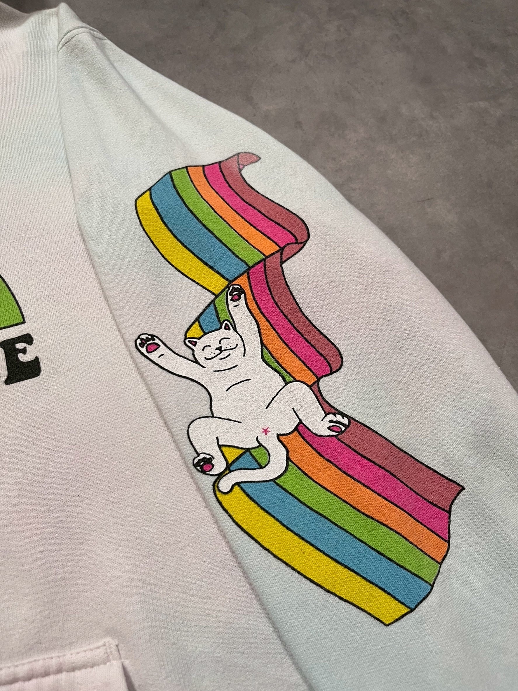 こちらはユニコーンにまたがる猫とレインボーの大胆なフロントプリントに加え、両袖にもレインボー×猫の袖プリ入り