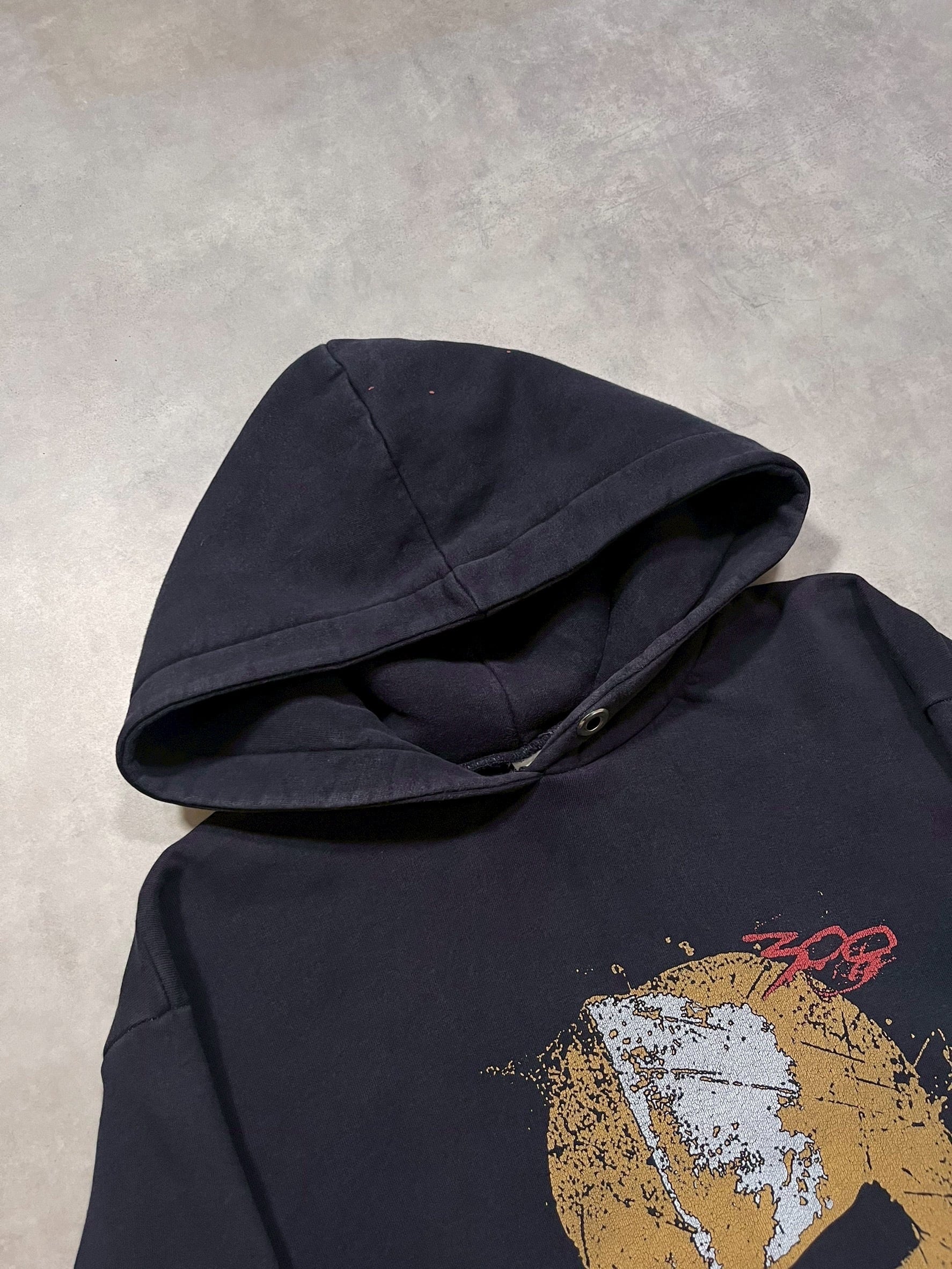 フード、右袖口に塗料