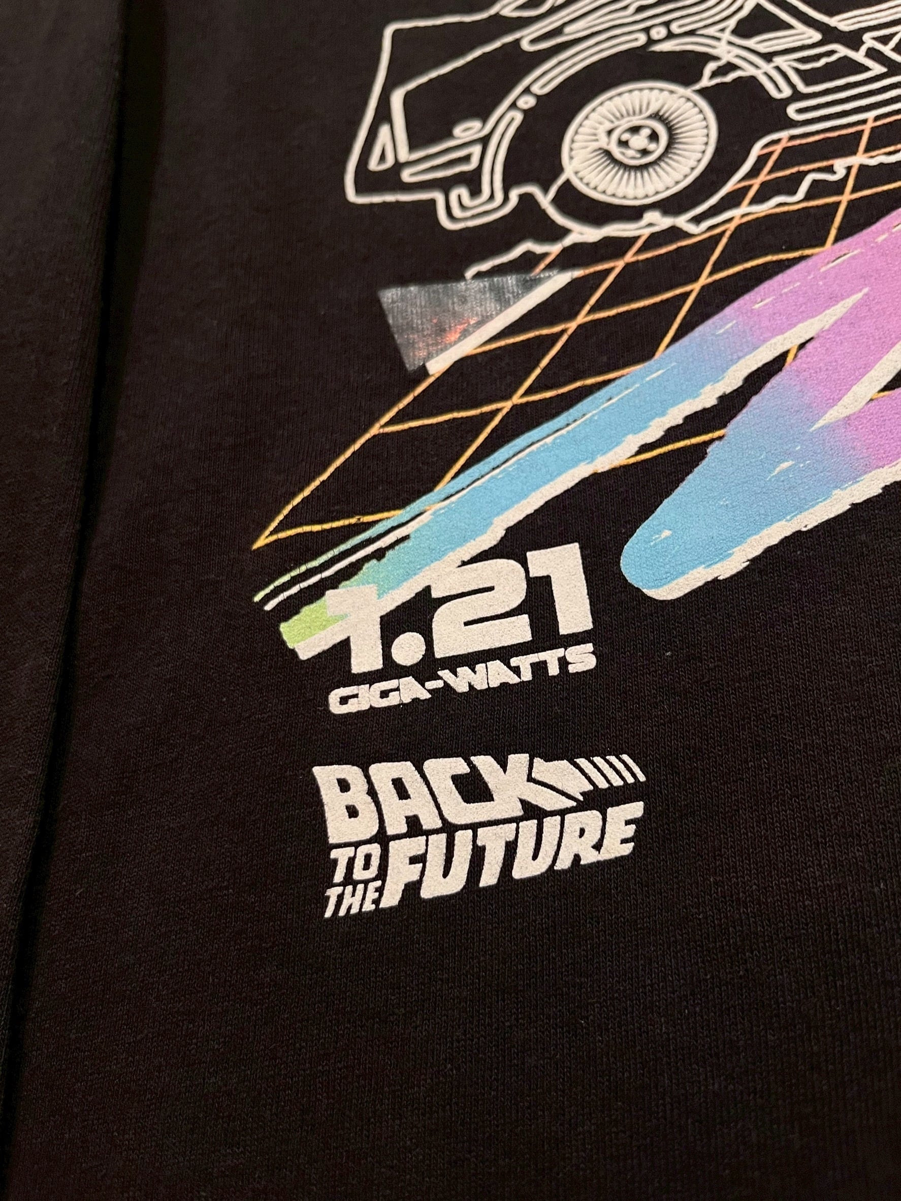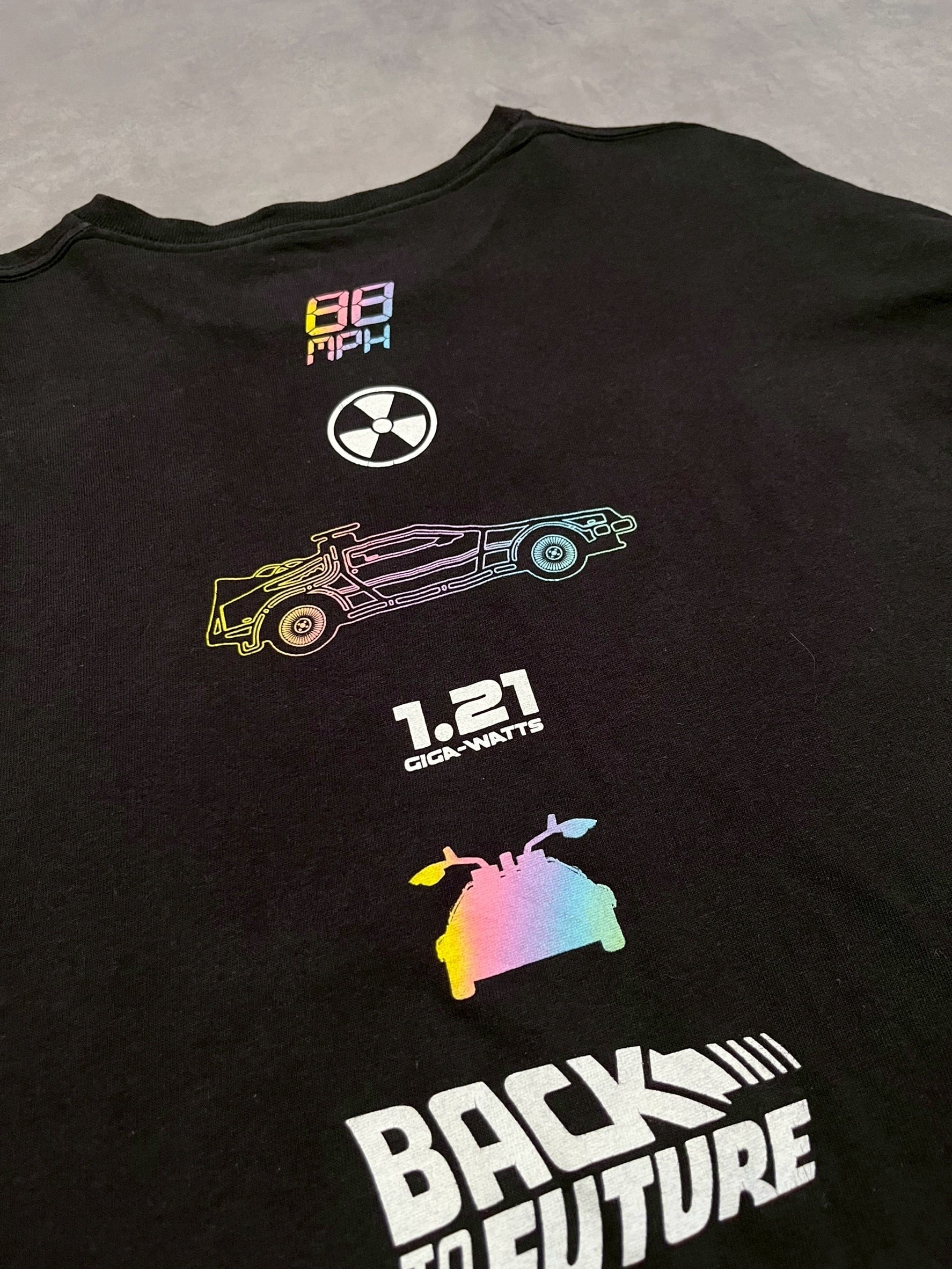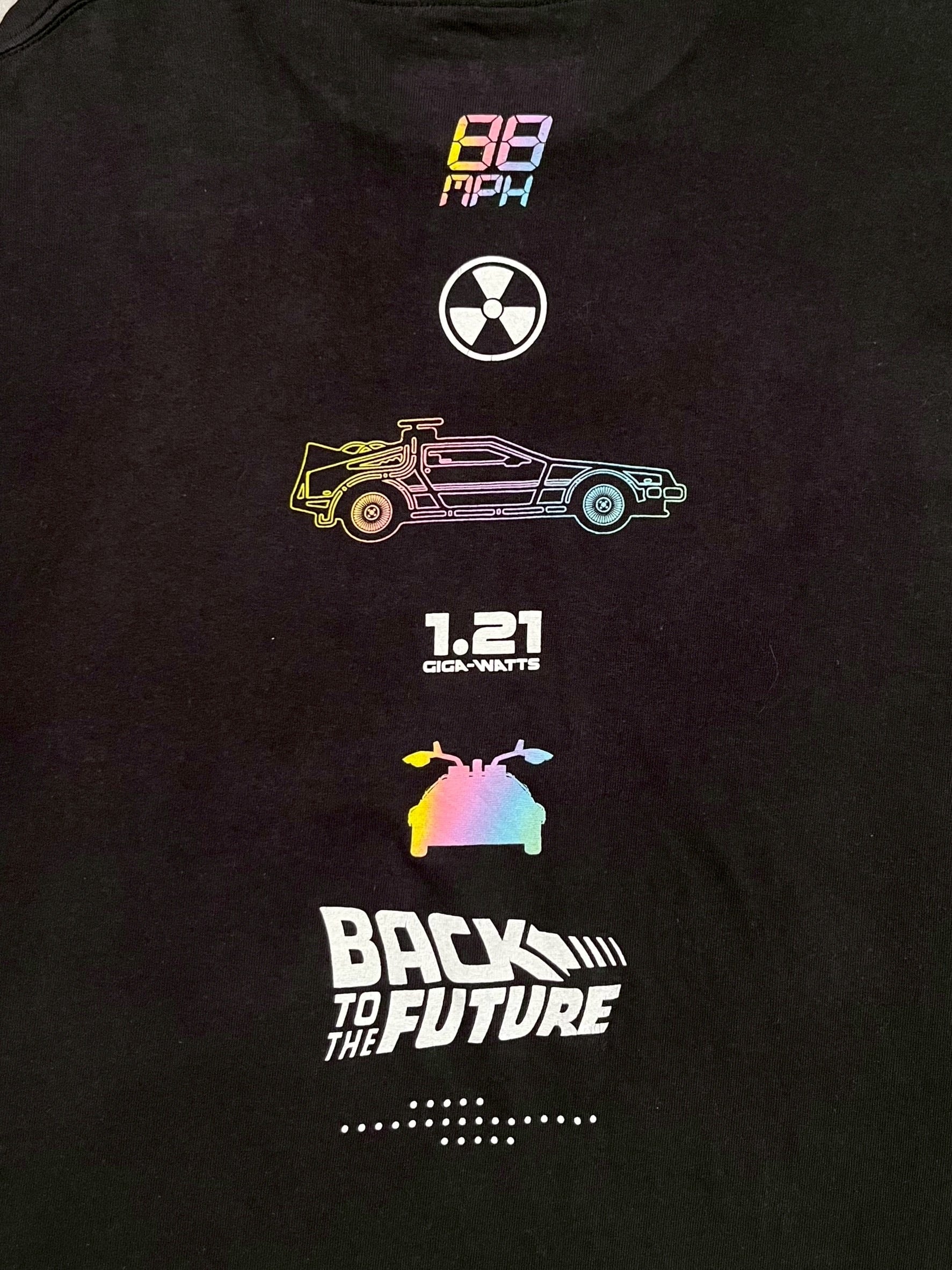フロントにはデロリアン、バックにはデロリアンがタイムトラベルするのに必要なスピード88マイルと電力1.21ジゴワットの数値が入った1枚