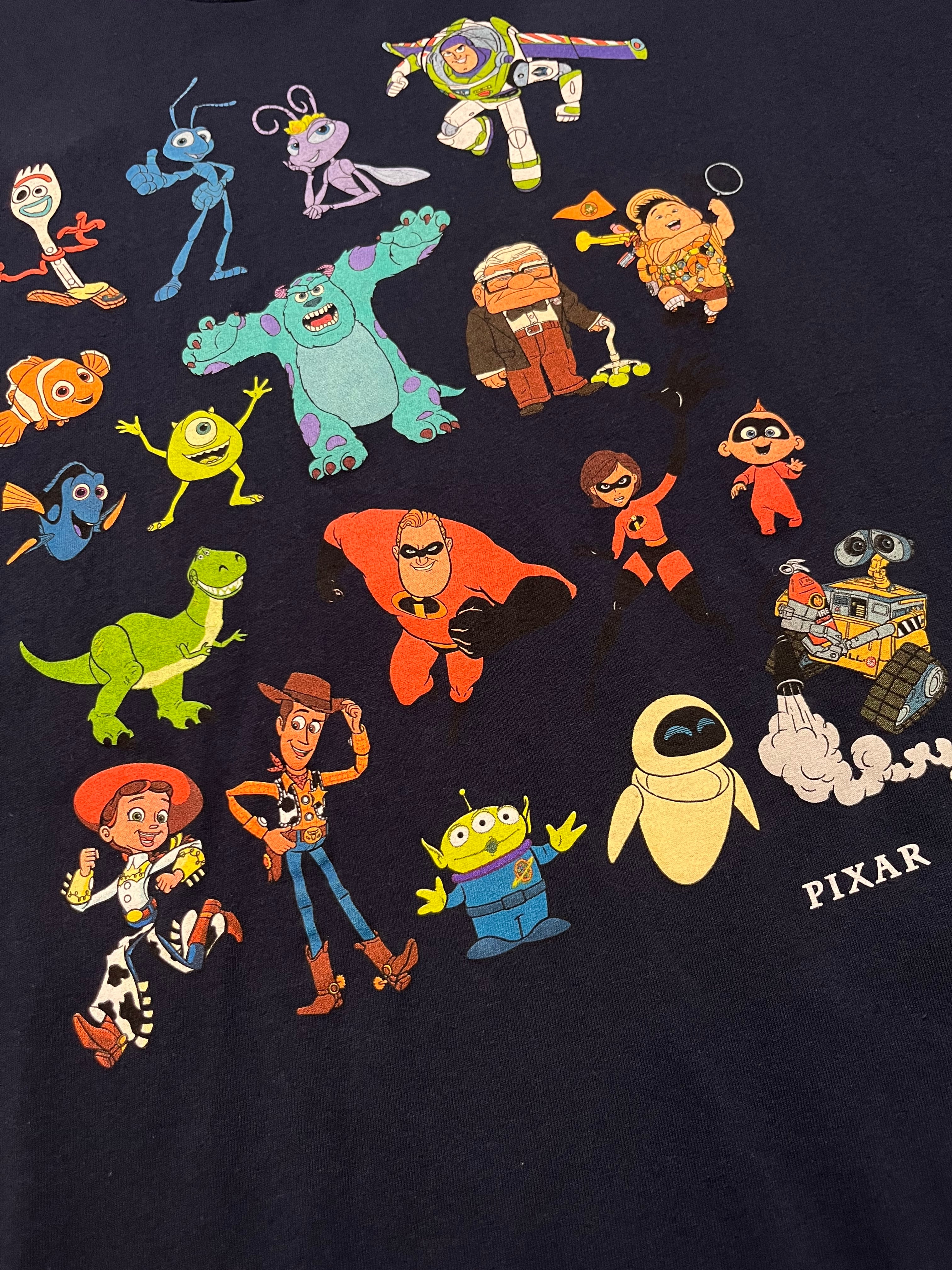 ピクサーの手掛けるトイ・ストーリーやモンスターズインク、バグズ・ライフ等をはじめとしたキャラクターがプリントされた1着