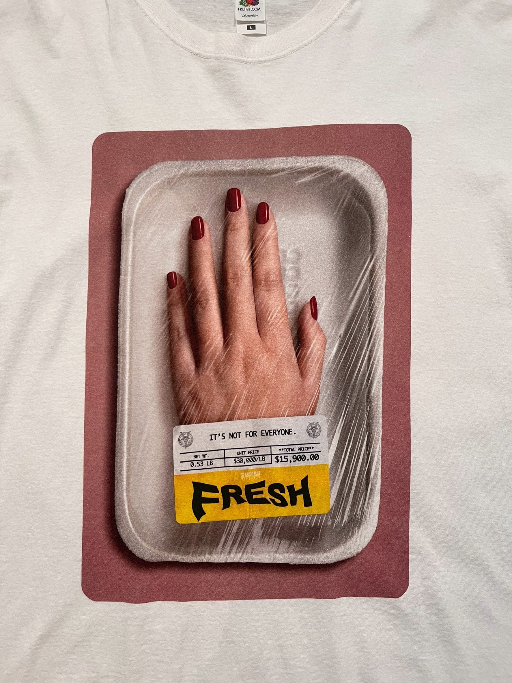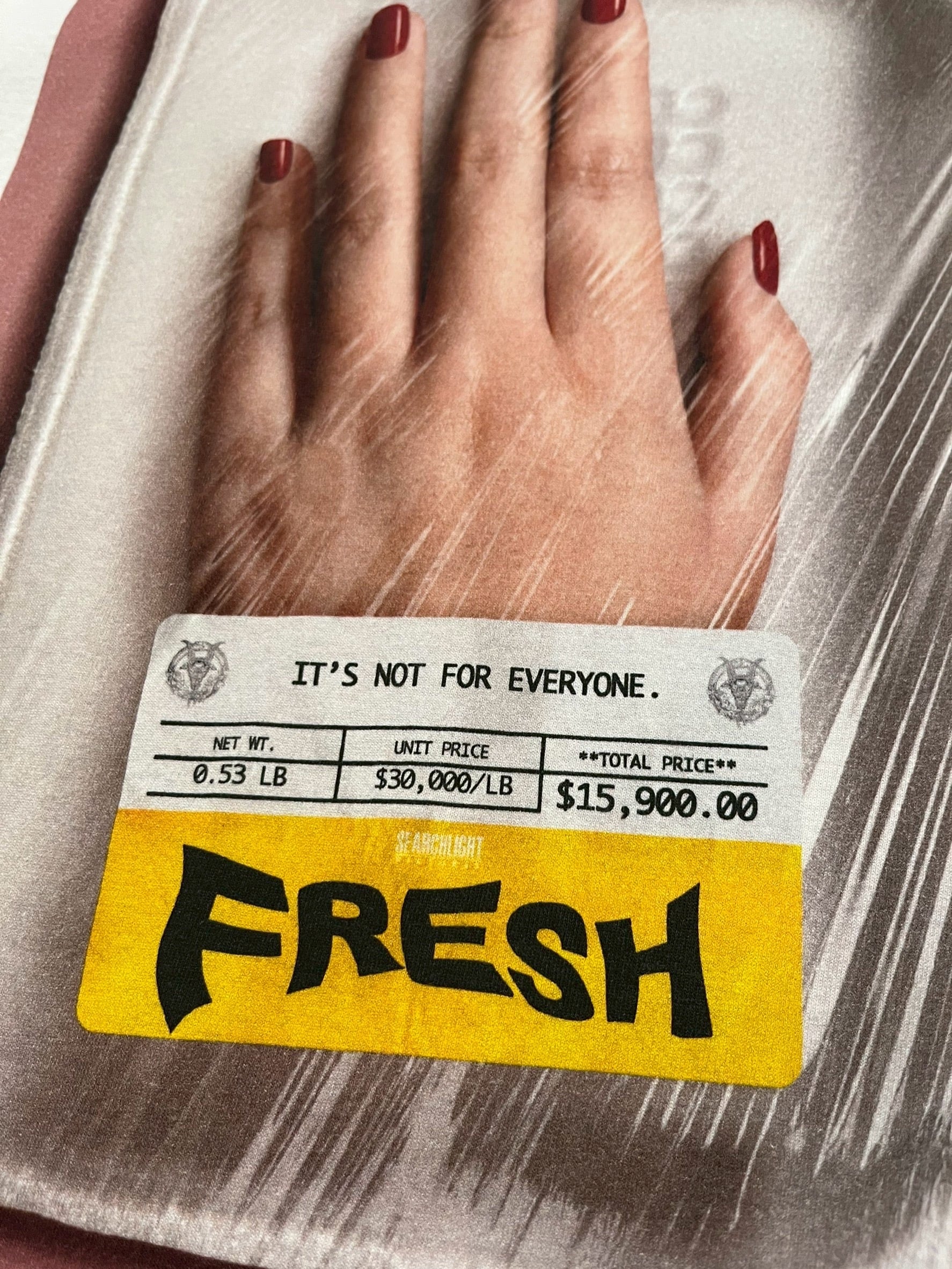 女性の手首がまるで精肉店で売られているようなパッケージに包まれたホラーチックなプリントです