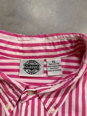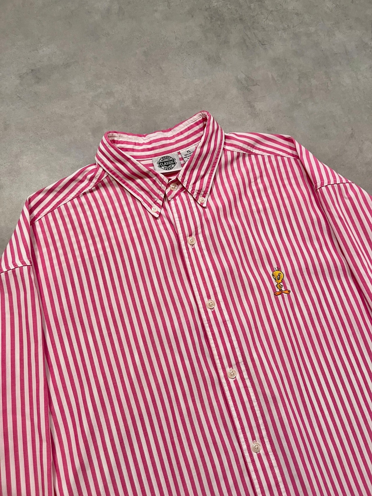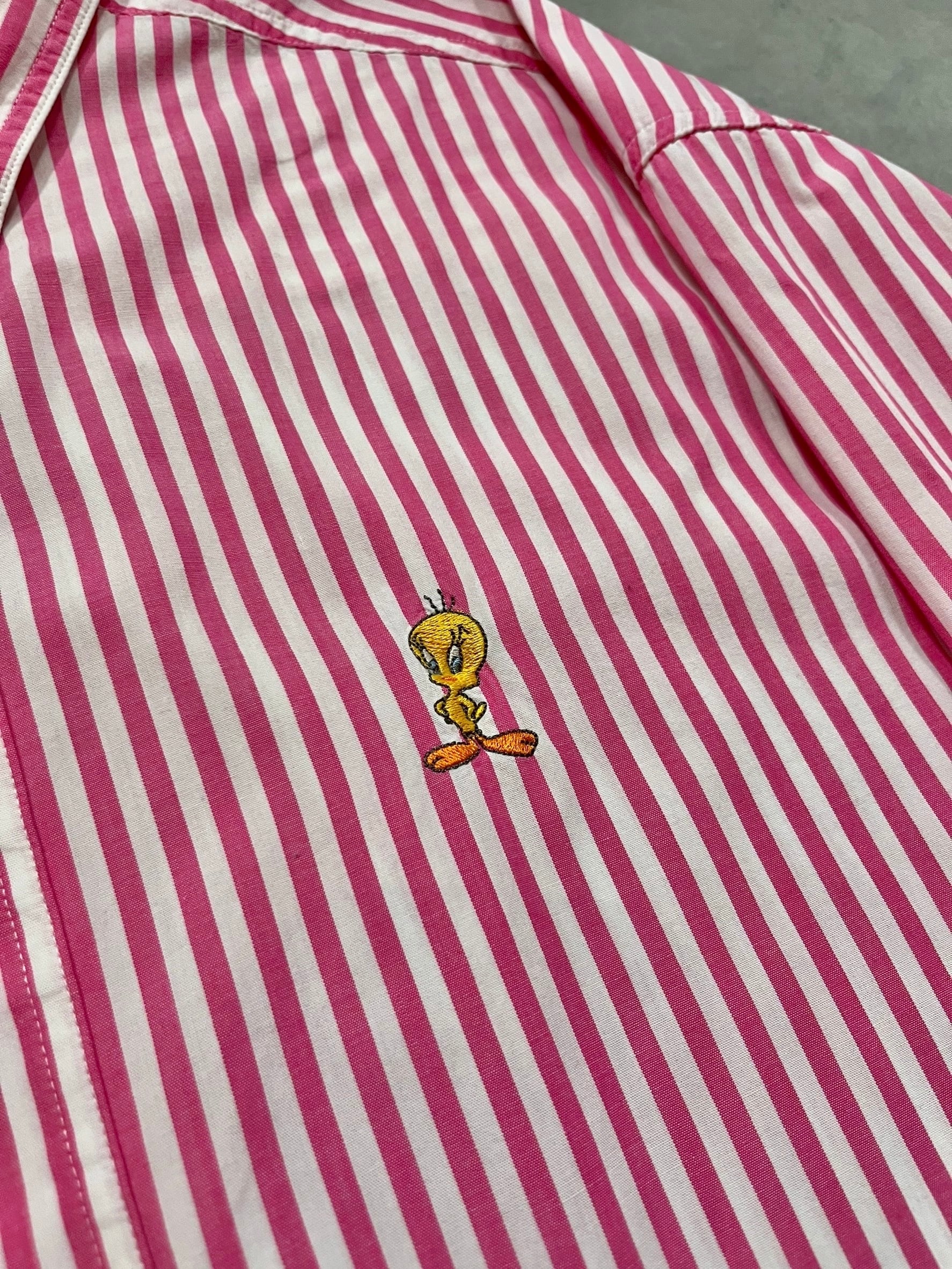 こちらはピンク×ホワイトの発色の良いロンドンストライプに、胸元にはトゥイーティーのワンポイント刺繍が入った1着