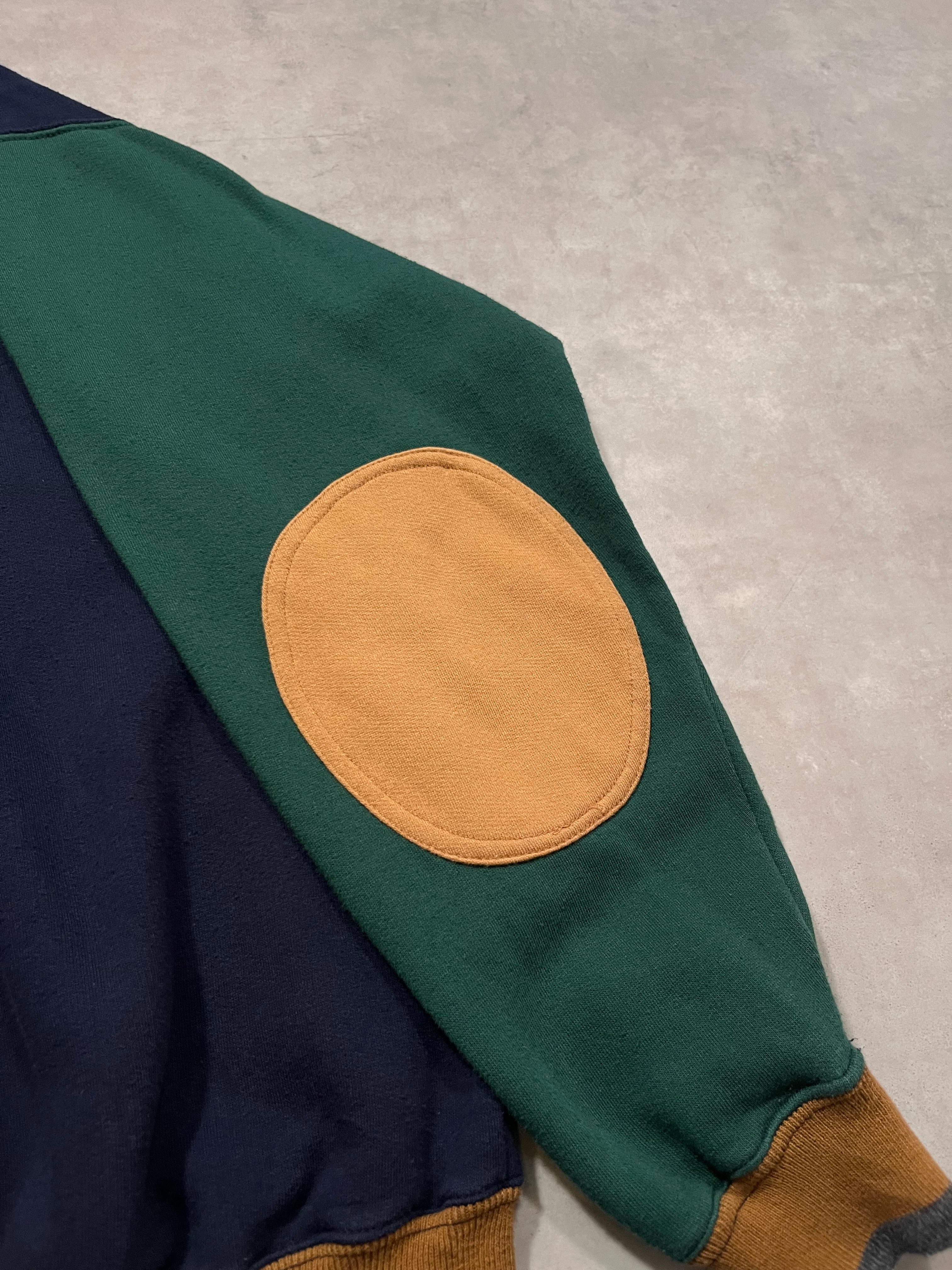 ネイビー×グリーン×ベージュで切り替えられておりエルボーパッチやリブ切り替えもアクセントになっています