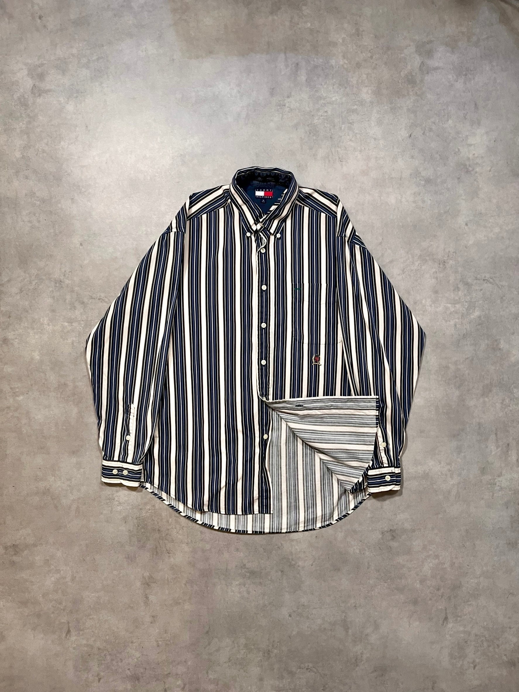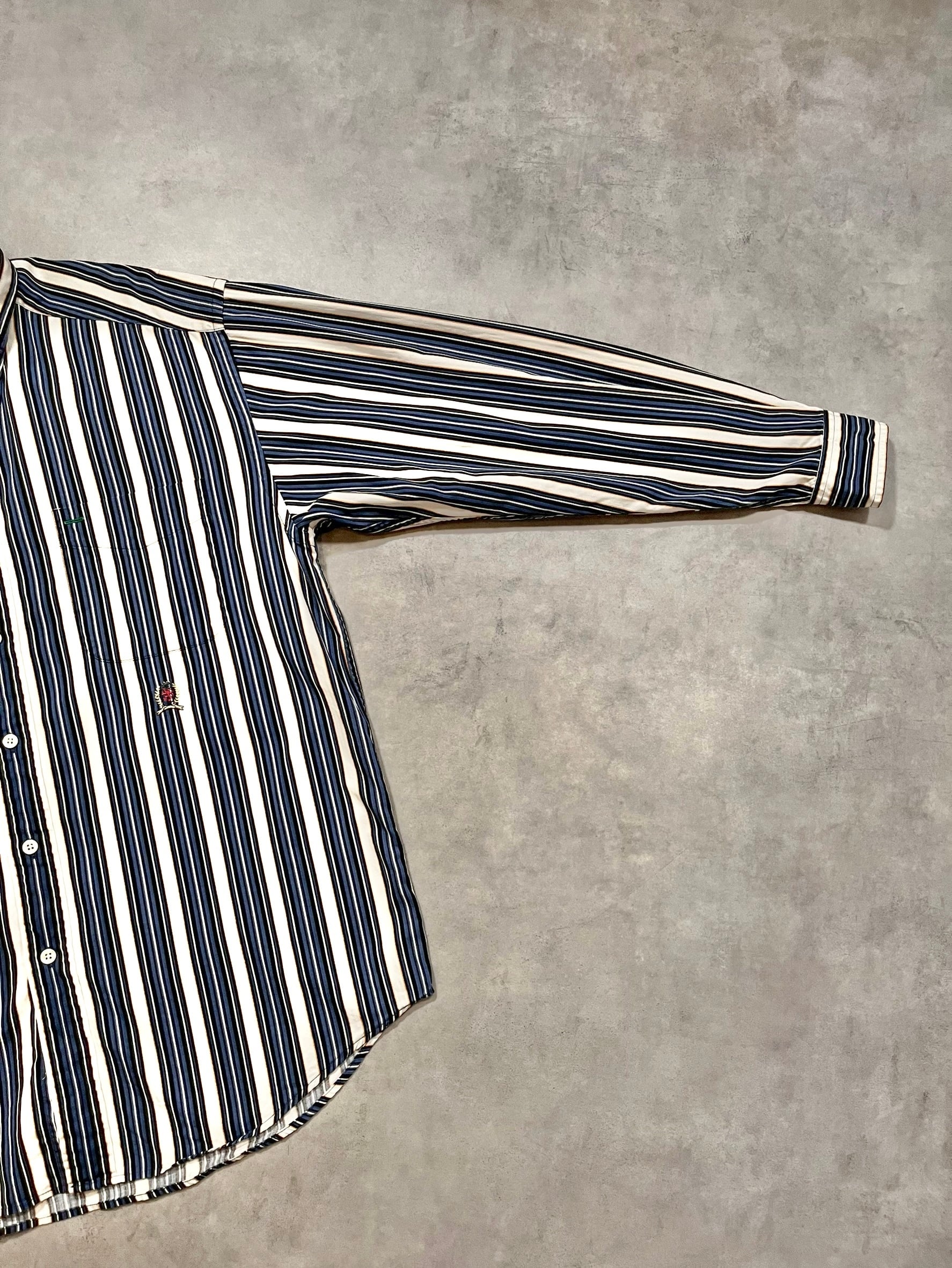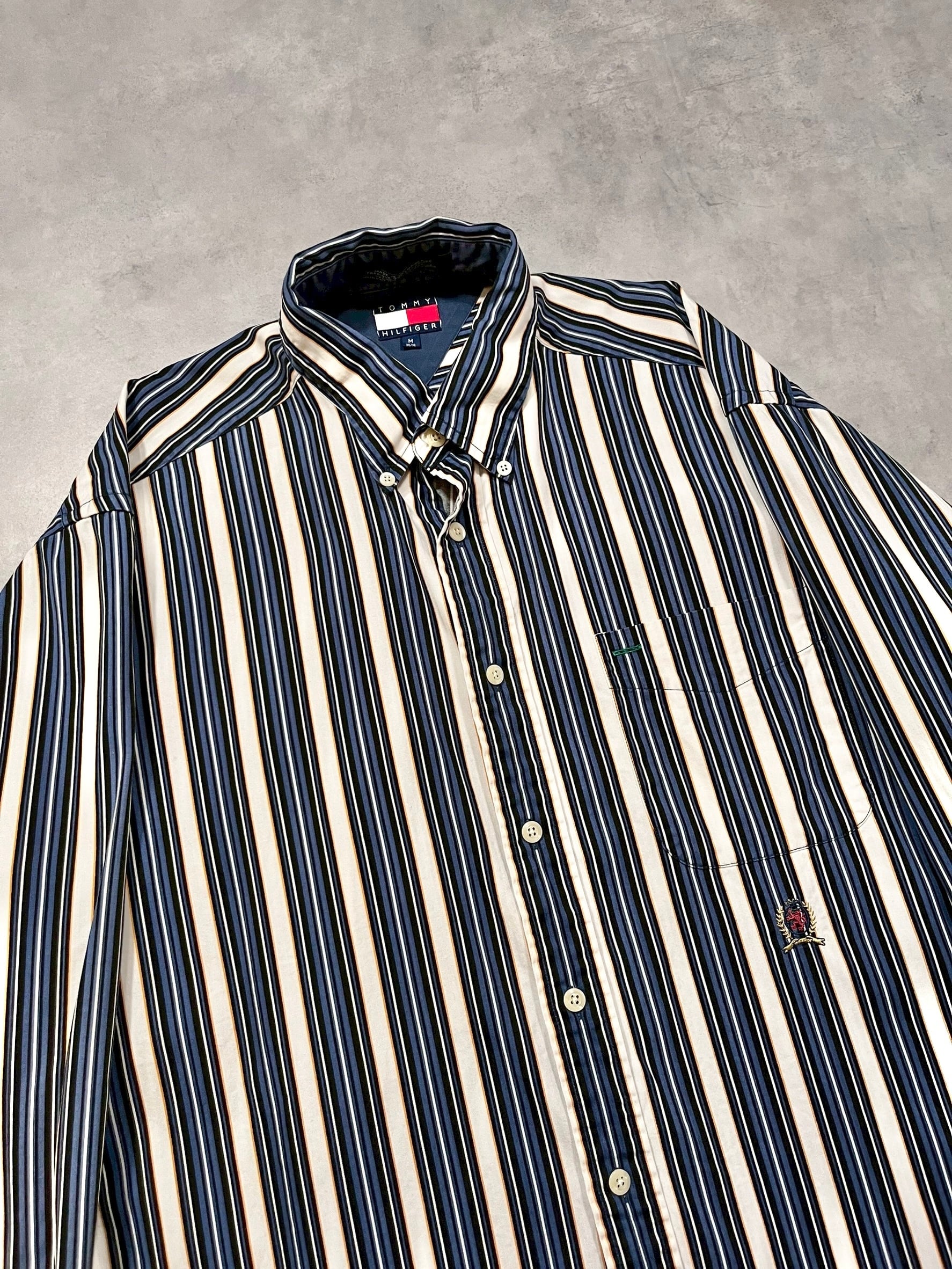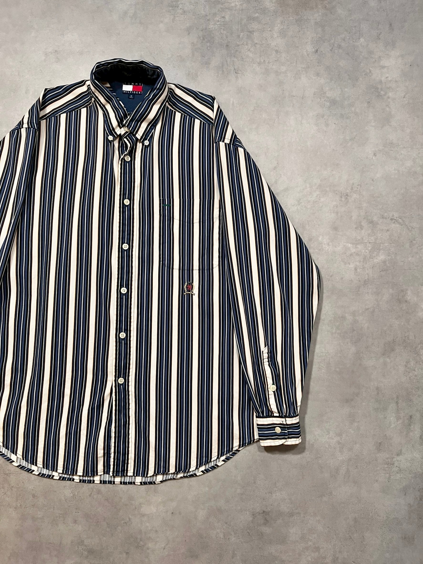 90年代のトミーらしいマルチストライプにこの年代特有のエンブレム刺繍がアクセントになった1着