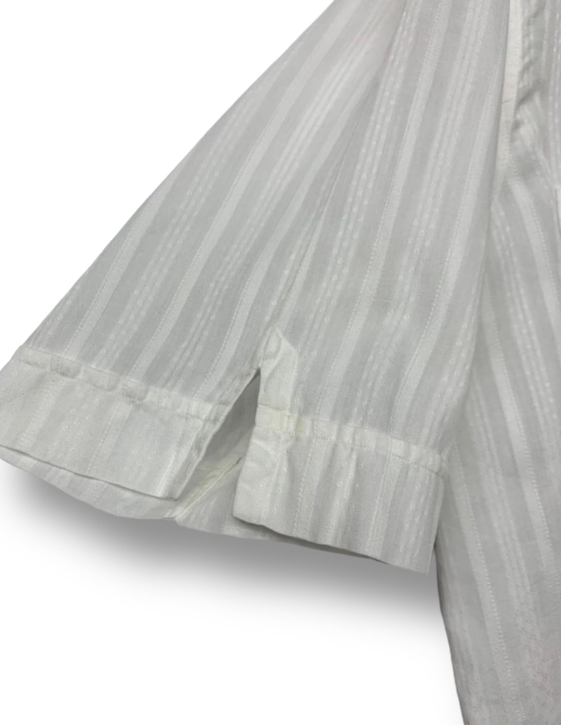 ホワイトベースに織りで柄が入っており非常に良い雰囲気です、その柄以外の部分がシースルーになっておりインナー次第で見え方の変わるシャツです
