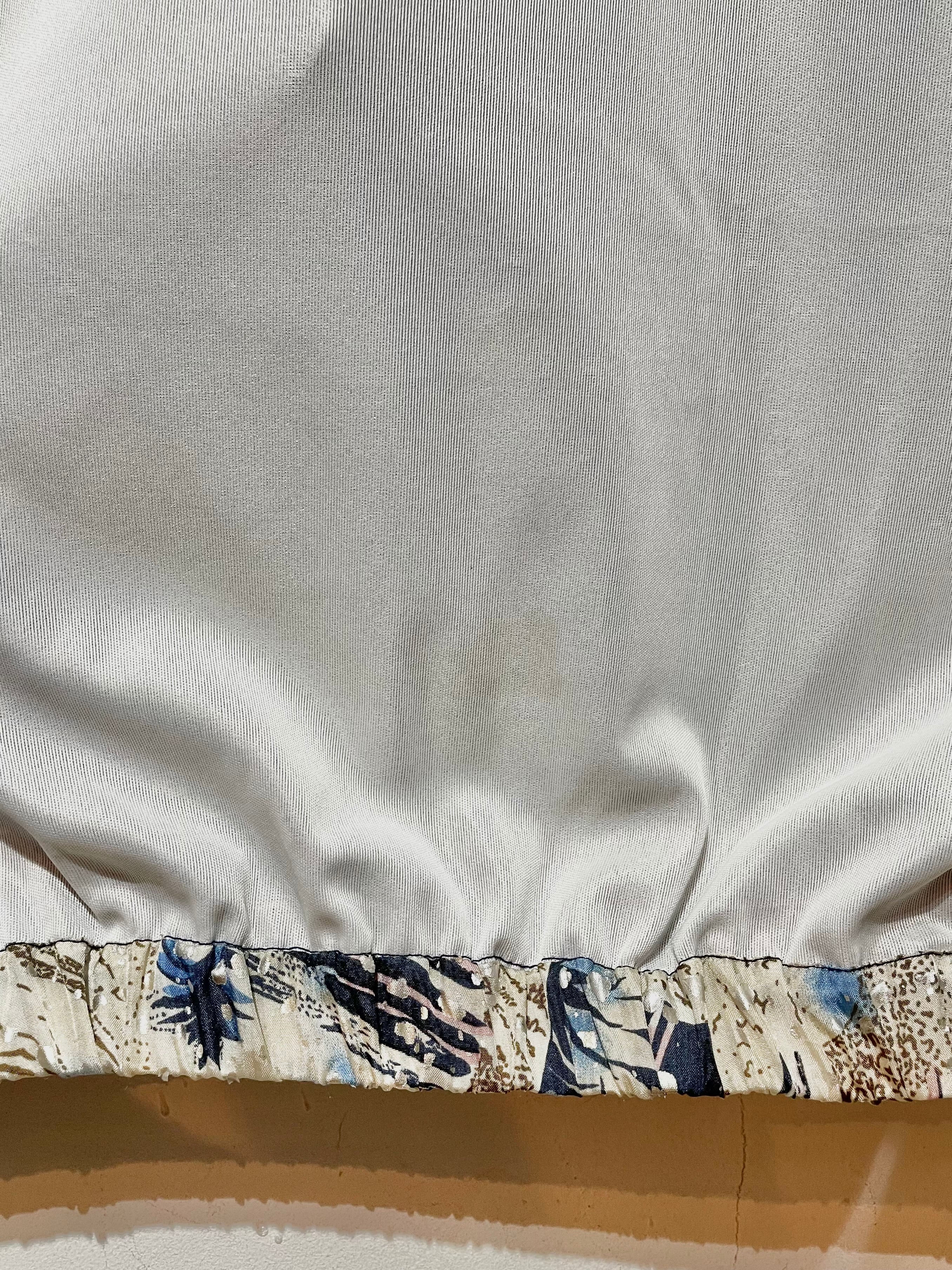 無地ネイビーと抽象的な柄の切り替えナイロンジャケットです