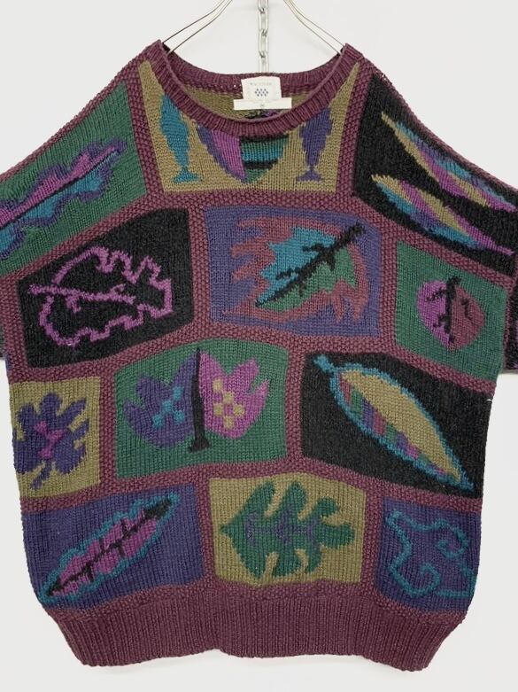 リーフ柄をダークなカラーリングで表現したハンドニットです