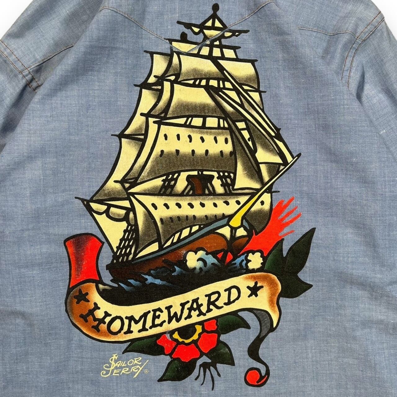 80-90’s “Sailor Jerry” L/S Printed Chambray Shirt