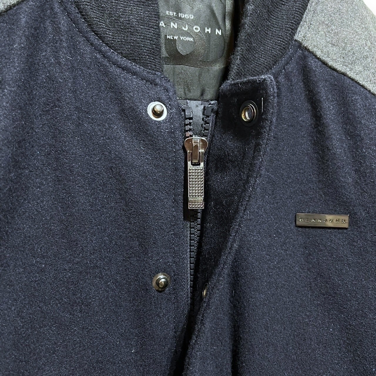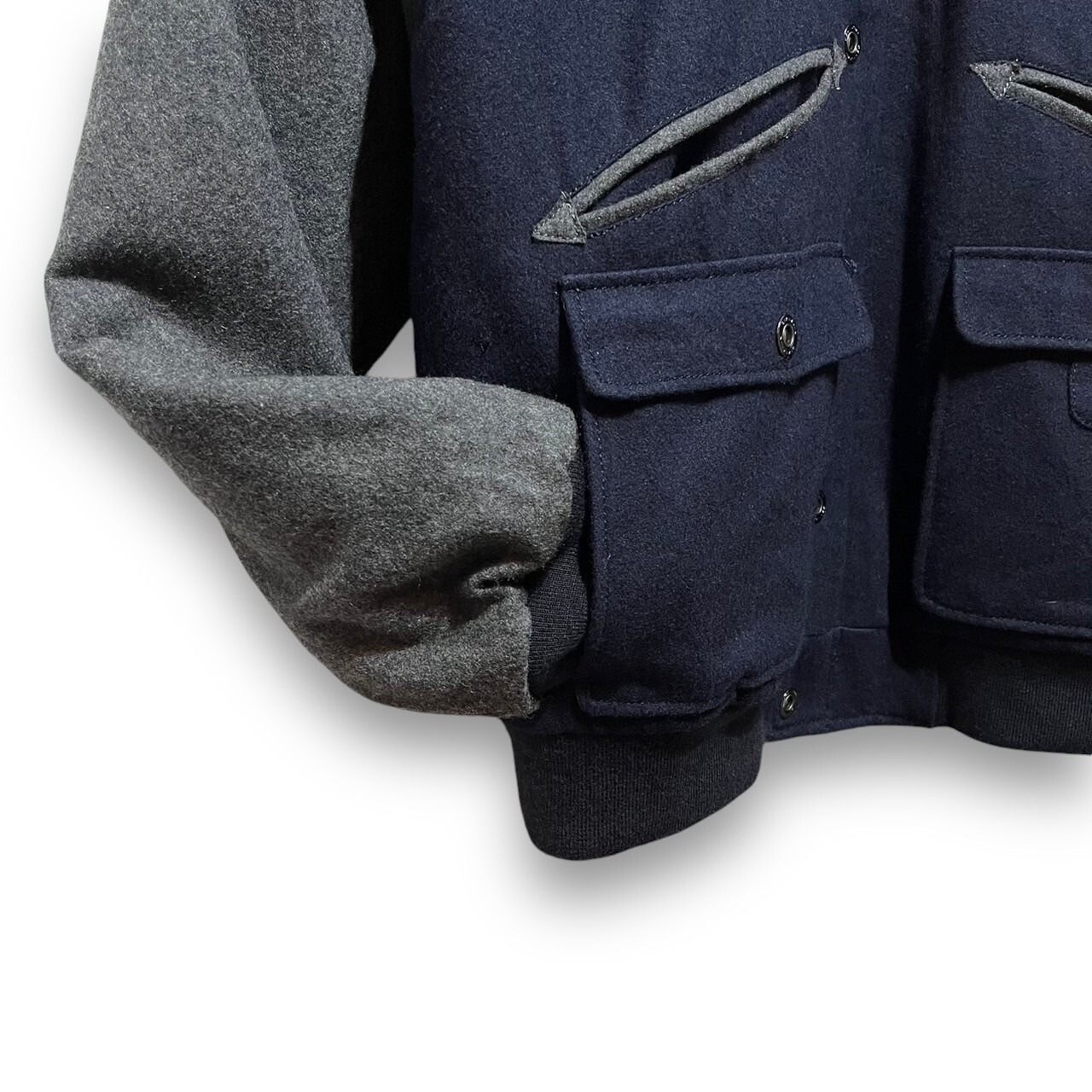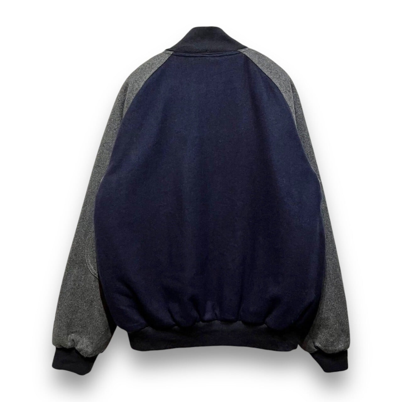 チャコールグレーとネイビーカラーのスタジアムジャケット