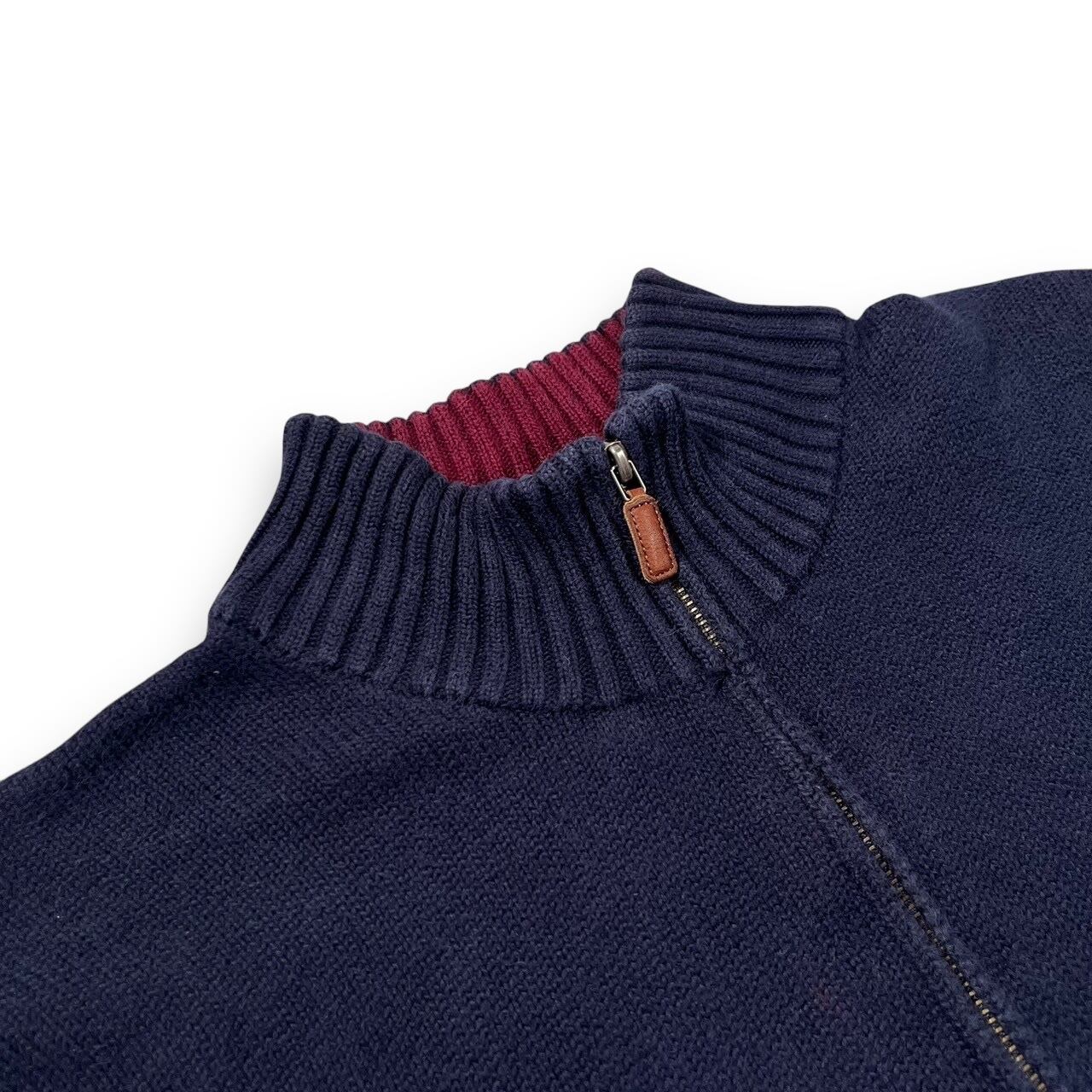 よくあるハーフジップニットとは少し違い襟裏がレッドになっているタイプ、襟を倒した時に良いアクセントになってくれます