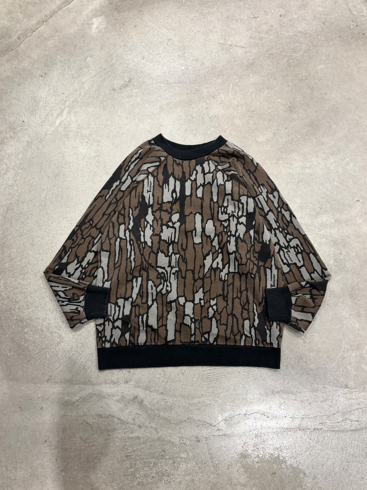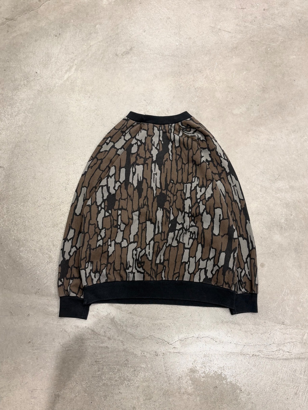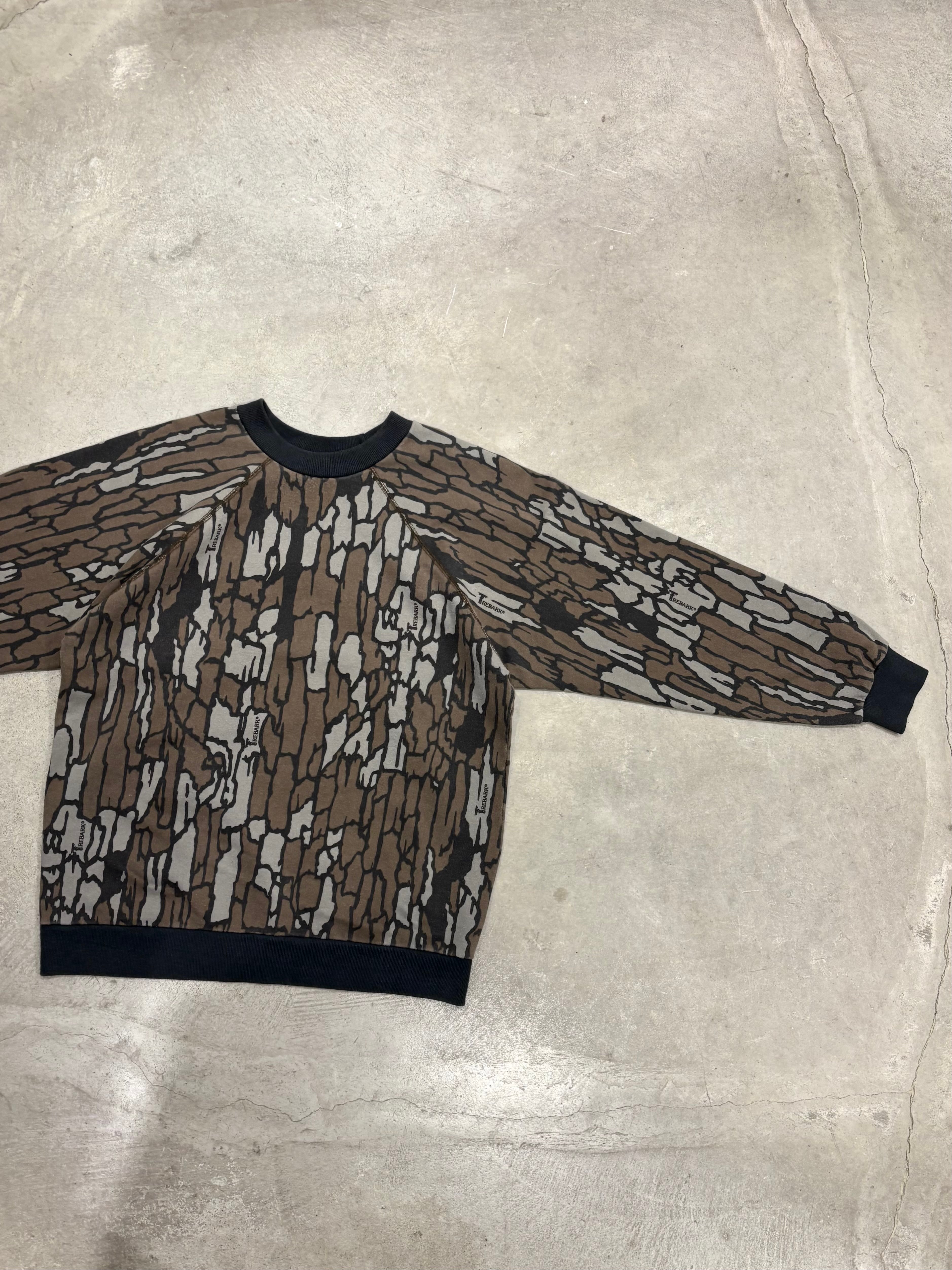 樹皮や木々をリアルに再現した狩猟やアウトドア用のカモフラージュ柄の一種、トレバークカモのスウェット