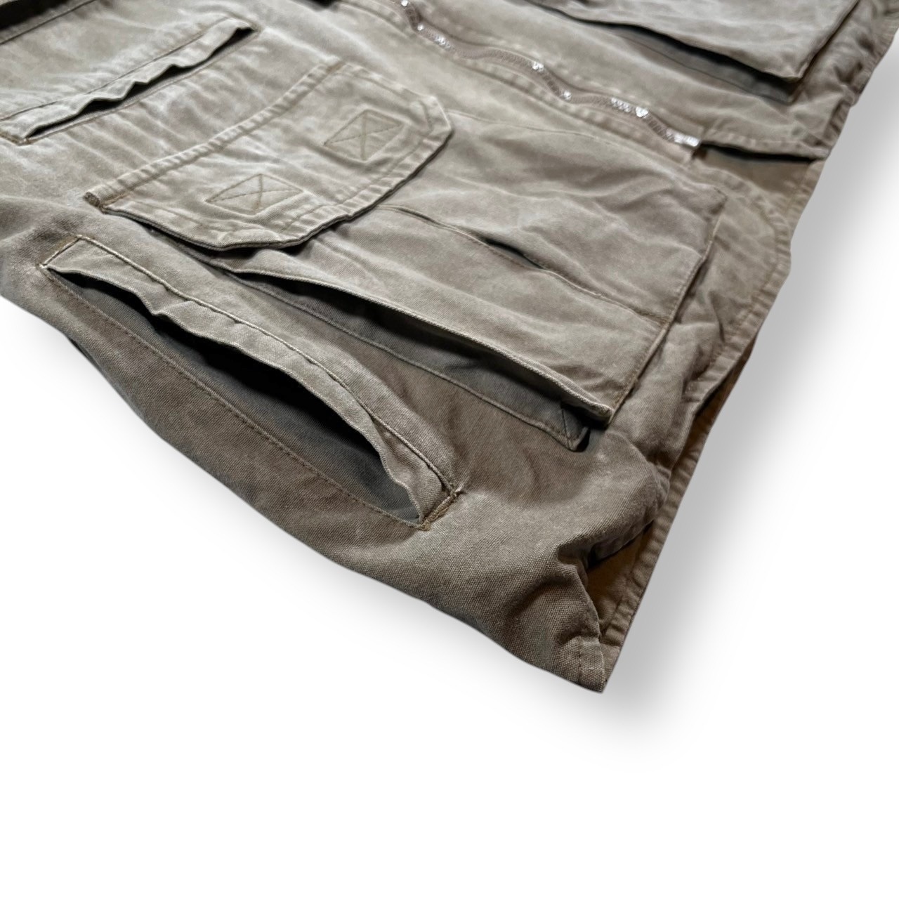 フラップ付きのポケットやスラッシュポケット、ジップ付きのポケット、バックポケット、合計13個のポケットが付いた1着